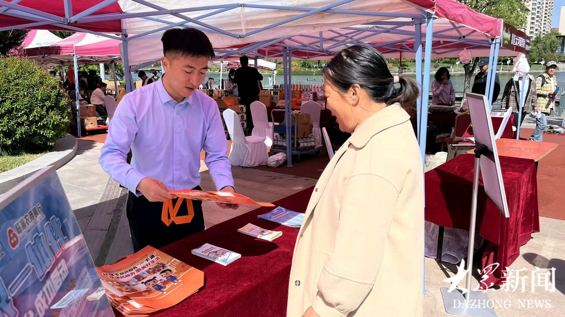 活动现场,临淄农商银行的党员志愿者们向前来逛市集的市民群众发放各类金融知识宣传折页和便民服务物料,热情讲解社保卡惠民政策,耐心细致地介绍社保卡的便捷功能与相关福利,引导市民了解社保卡在日常消费、民生服务等场景中的实用价值,并手把手协助市民完成社保卡绑定、功能激活等操作,让群众切实感受到社保卡带来的便利与实惠。