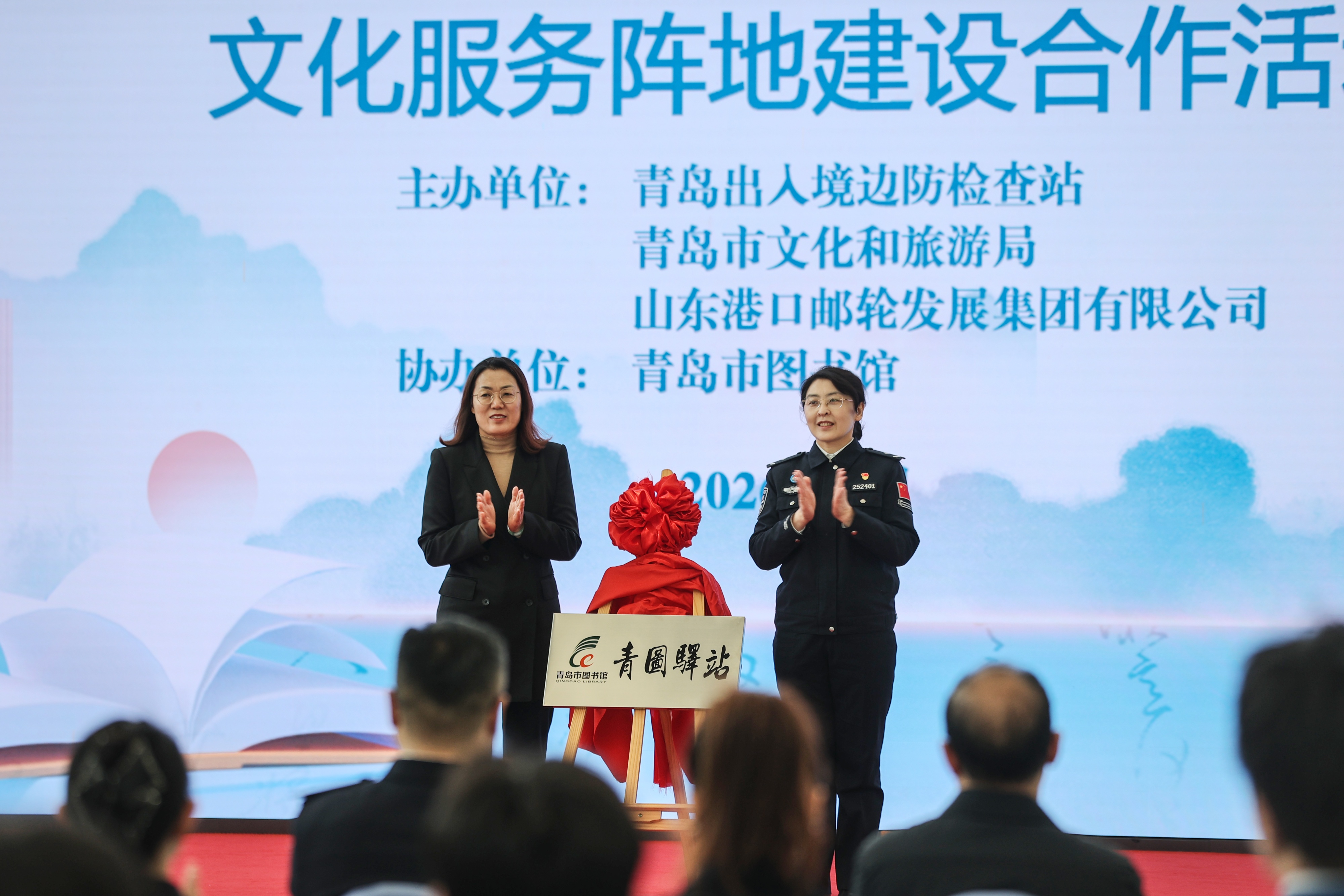 在热烈的掌声中,活动迎来重要环节——青岛市图书馆馆长徐月霞与青岛边检站站长解晓燕共同为“青图驿站”揭牌。红绸落下,牌匾亮出,标志着青岛市图书馆与青岛边检站的合作共建正式落地,首个设在口岸执勤现场的新型公共阅读空间正式启用。