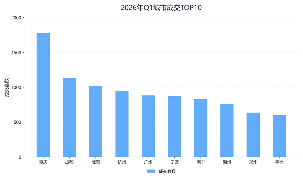 从成交套数来看,成都、重庆、威海位列全国前三。其中重庆成交超1700套,成都超1100套,房源套均总价集中在95万至115万元,亲民的定价贴合刚需和改善群体需求,成为大众置业热门目的地。