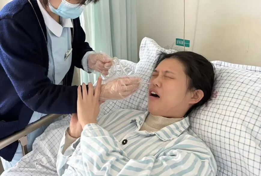 (殷雪晴进行模拟肢体约束体验)模拟胃管固定好后,同事按照规范,用约束带轻轻把我的双手固定住。那一刻,我才真正体会到患者那种无助又煎熬的感觉:胳膊被轻轻绑着,不能自由活动,想揉一揉酸胀的鼻子、擦一擦眼角的分泌物都做不到,就连换个舒服点的姿势都不行。我心里清楚,绑住双手、插胃管,都是为了患者的治疗安全、帮助他们尽快康复,但身体被束缚的感觉、不能自己做主的焦躁,再加上不舒服又没处说的委屈,搅在一起,让我心里又慌又-烦。直到这时,我才真正明白,那些长期插着管路、需要被约束的患者,平日里有多难受、多不容易。