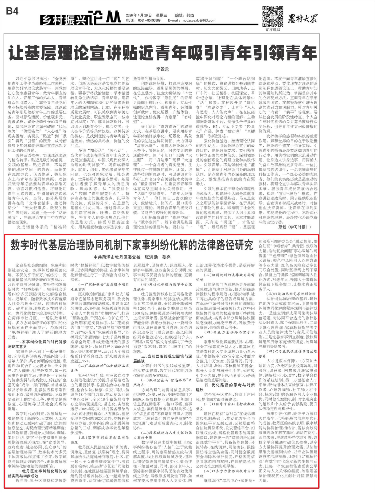 数字时代的到来,为破解这一难题提供了新路径。大数据、人工智能和移动互联网打破了部门之间的信息壁垒,实现治理资源精准调度;从风险预警、前端介入到诉中调解、案后回访,数字平台使家事纠纷全周期管理成为现实。在“党委领导、政府负责、社会协同、公众参与”的基层治理格局下,数字技术为多元主体高效协作搭建了桥梁。数字赋能与协同治理的结合,正是破解家事纠纷化解难题的关键所在。
