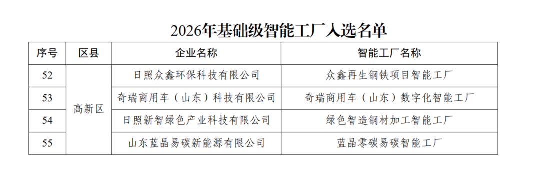 近日,日照市公布了2026年基础级智能工厂入选名单,高新区众鑫环保科技有限公司、奇瑞商用车(山东)科技有限公司、日照新智绿色产业科技有限公司、山东蓝晶易碳新能源有限公司4家企业成功上榜。