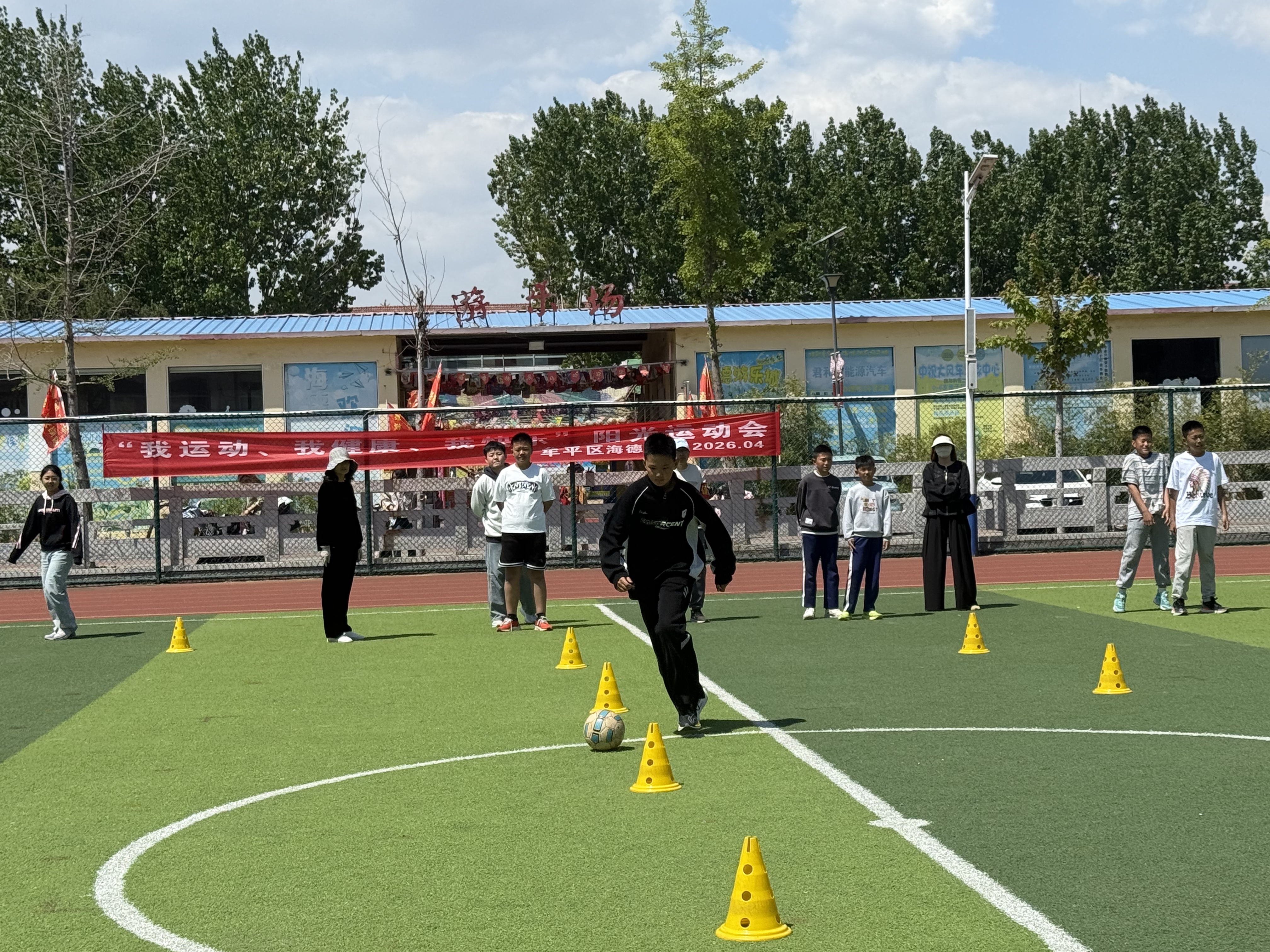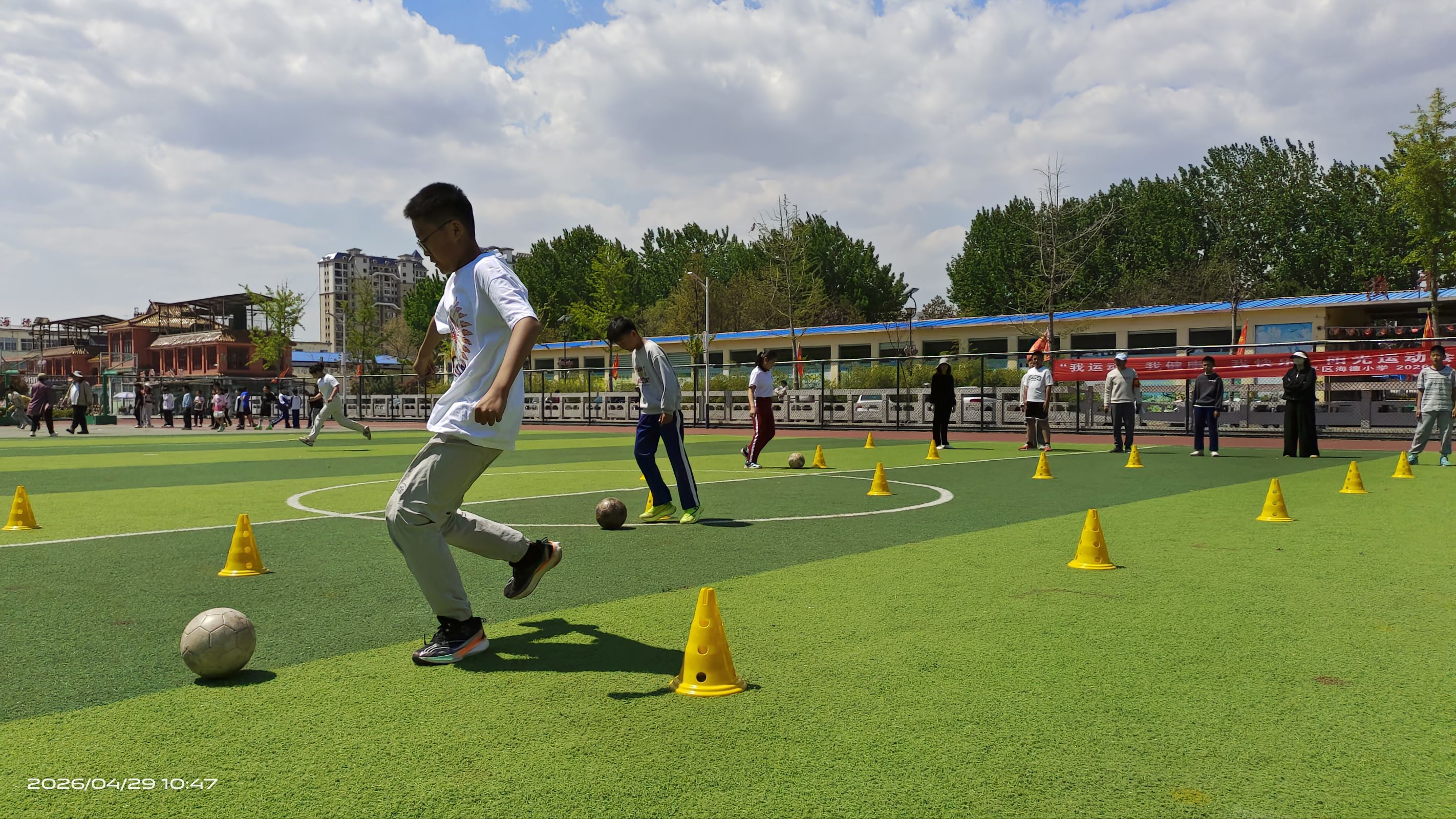 运动会现场,红色跑道与翠绿草坪相映成趣,同学们精神饱满、斗志昂扬。跑步赛道上,选手们如离弦之箭般向前冲刺,加油声、呐喊声此起彼伏;立定跳远场地中,同学们奋力一跃,在空中划出优美的弧线;足球运球过竿接力项目里,队员们默契配合,精准控球、快速传递,展现了良好的团队协作能力;仰卧起坐区域,大家咬紧牙关、全力挑战,用坚持诠释着永不言弃的体育精神。