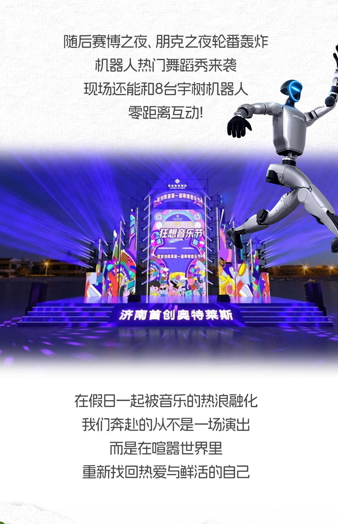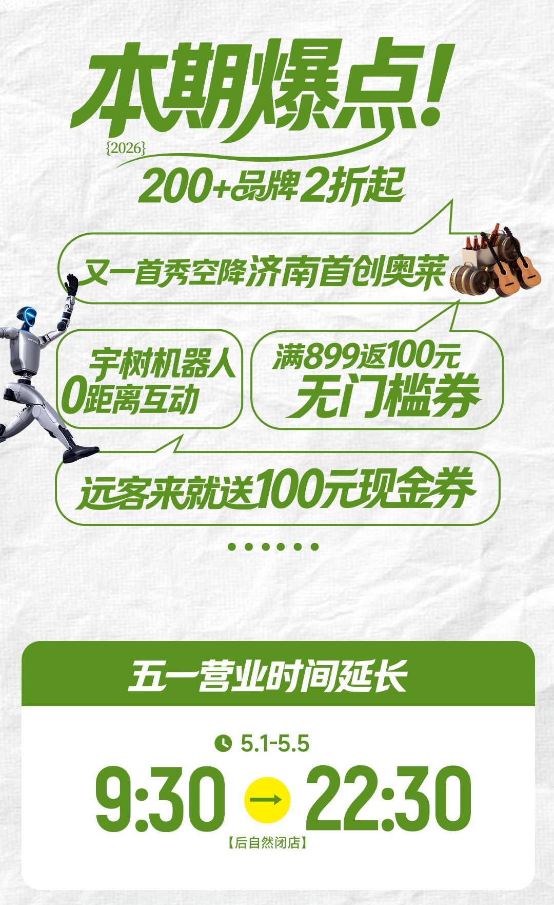 这个五一假期,济南首创奥莱以“51JUST「玩」 放「价」就要尽兴”为主题,重磅开启一站式假日狂欢!免费开放超级民谣之夜,动感旋律点燃假日氛围;宇树机器人互动、唯美空中芭蕾等特色表演轮番上演,带来沉浸式视听盛宴。购物福利同步拉满,场内200+知名品牌低至2折,超百家品牌单笔消费满899元即返100元无门槛券,外地到店顾客还可领取100元现金券,多重优惠叠加超划算。这个五一假期,济南首创奥莱集潮流演艺、趣味互动、超值购物于一体,为顾客打造丰富、尽兴、高性价比的假日休闲体验,轻松解锁吃喝玩乐购一站式狂欢。