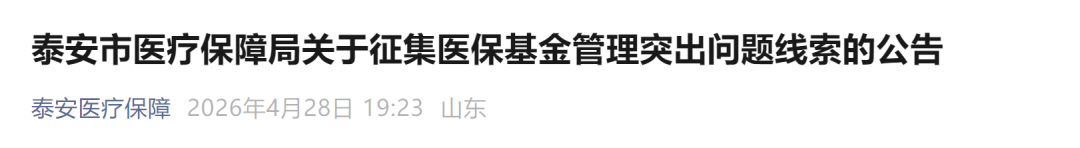 4月28日,泰安市医疗保障局发布关于征集医保基金管理突出问题线索的公告,详情如下:
