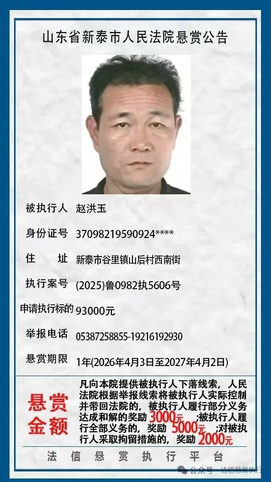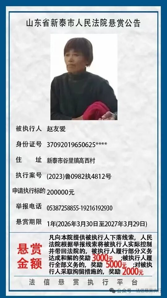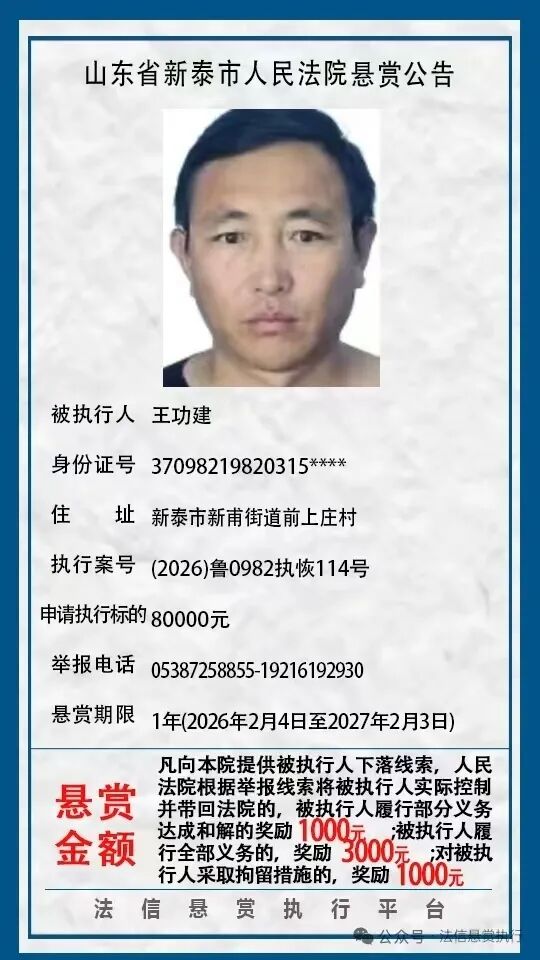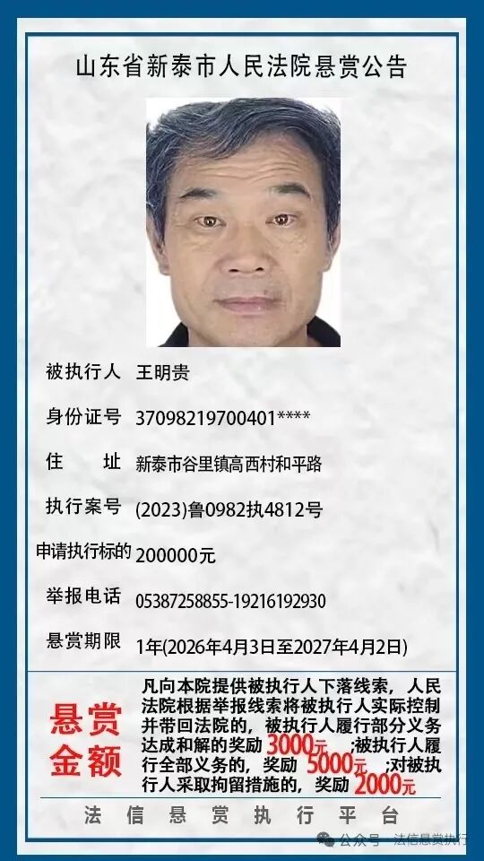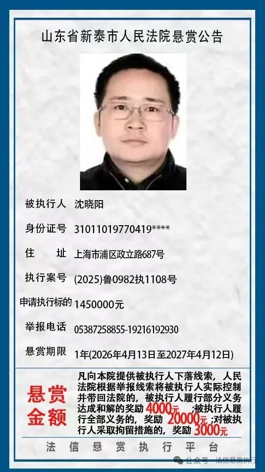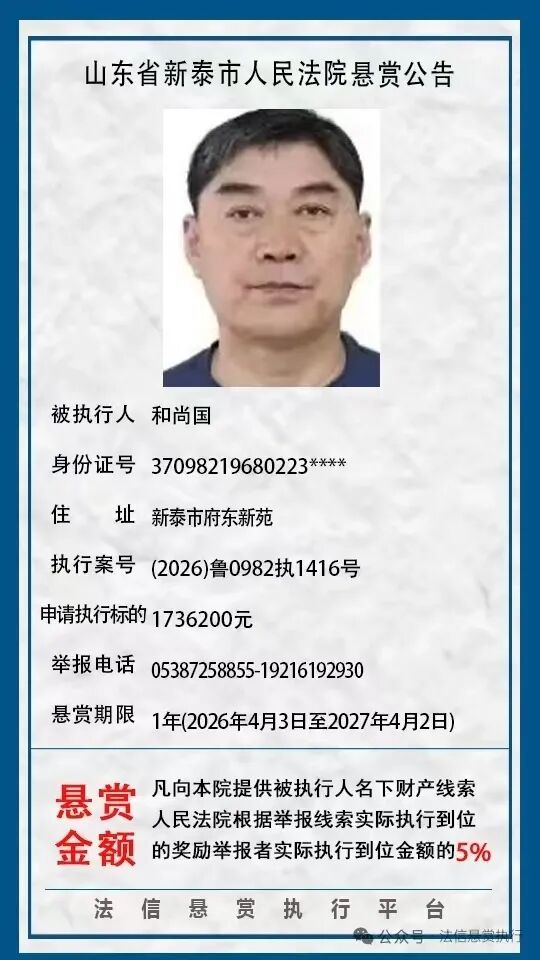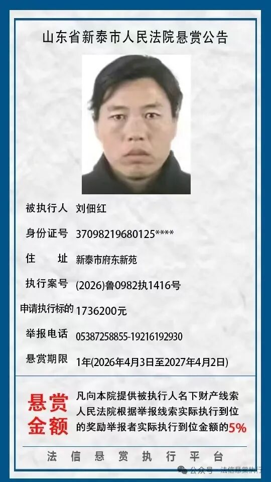 近日,新泰市人民法院发布8则悬赏公告,具体如下:(新泰市人民法院)(齐鲁晚报·齐鲁壹点客户端欢迎各界投稿,提供线索,包括文字、照片、短视频。泰安新闻素材请联系齐鲁晚报泰安融媒中心,热线电话:0538-6982110。)