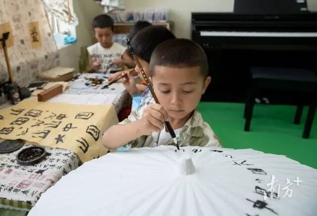 一项项中华优秀传统文化为粤疆民族交往、交流、交融提供了鲜活载体。图为新疆孩子学习毛笔书法。