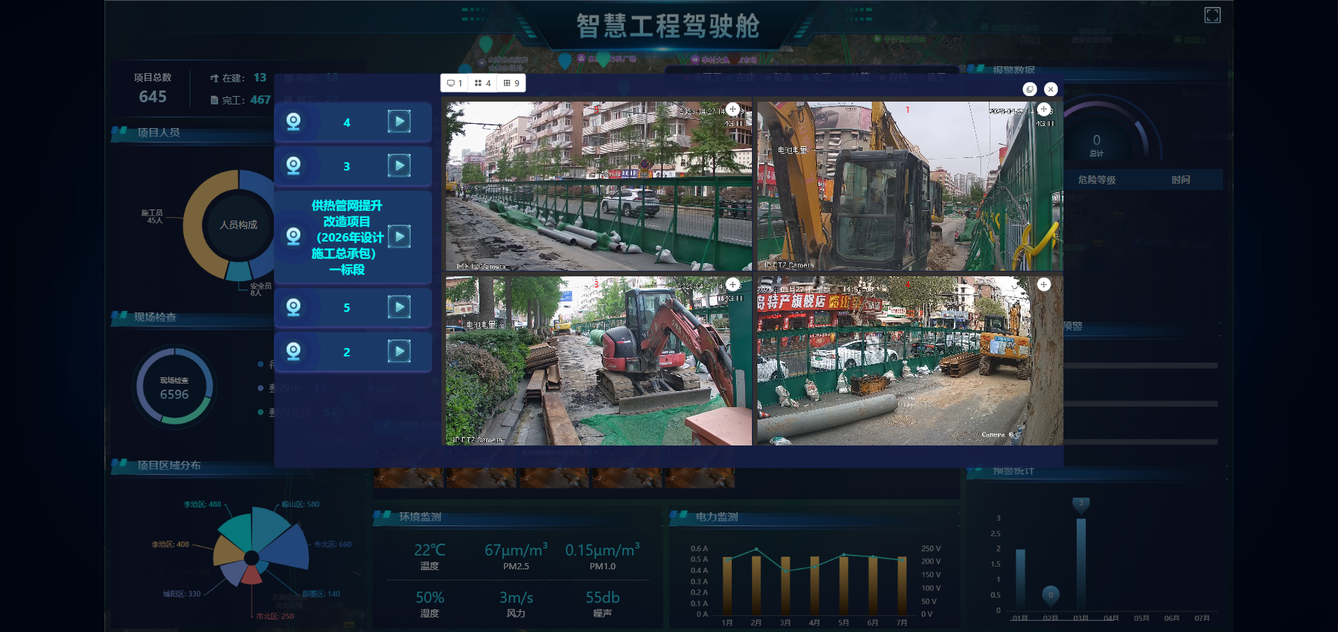 发展集团充分依托智慧工程安全管理系统,运用AI智能识别摄像头、项目定位电子围栏等先进技术,对施工区域实施全天候全方位动态监控,实现施工进度实时掌控、安全隐患智能预警、问题处置快速响应,推动工地管理从传统人力巡查向智能感知、主动防控模式转变。在视频监控方面,台东一路施工现场布设5台高清光伏智能摄像机,对各工作面及现场交通状况进行全天候实时监控,视频资料自动存储,便于后期追溯与复盘。同时,系统与市北区交警部门实现视频互通与协同联动,进一步提升施工区域及周边道路的通行效率。