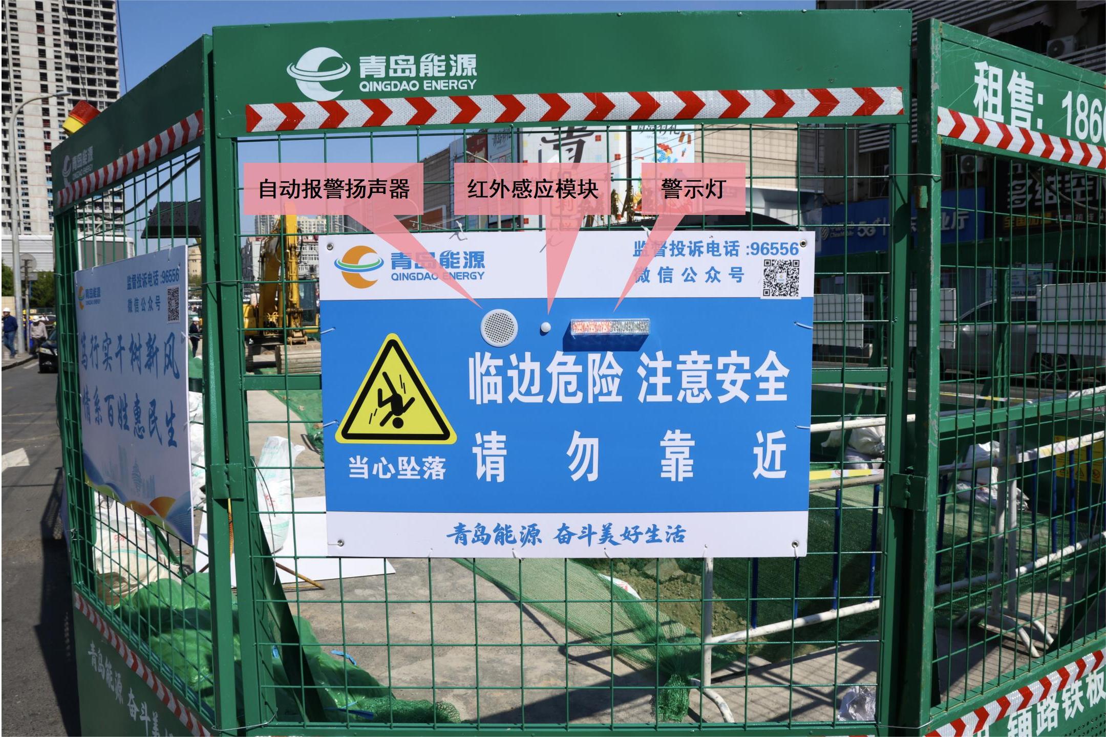 在提升文明施工与便民服务水平的同时,发展集团进一步聚焦施工区域本质安全,创新引入红外感应声光警示系统,变被动提醒为主动预警,从源头防范人员误入风险。红外感应系统构建起非接触、全天候、可交互的智慧防护体系——人员靠近即自动触发灯光与语音双重提醒,将静态警示牌升级为“会说话”的安全屏障,推动安全意识从“要我安全”向“我要安全”转变,实现安全管理从事后补救向事前预防转型。
