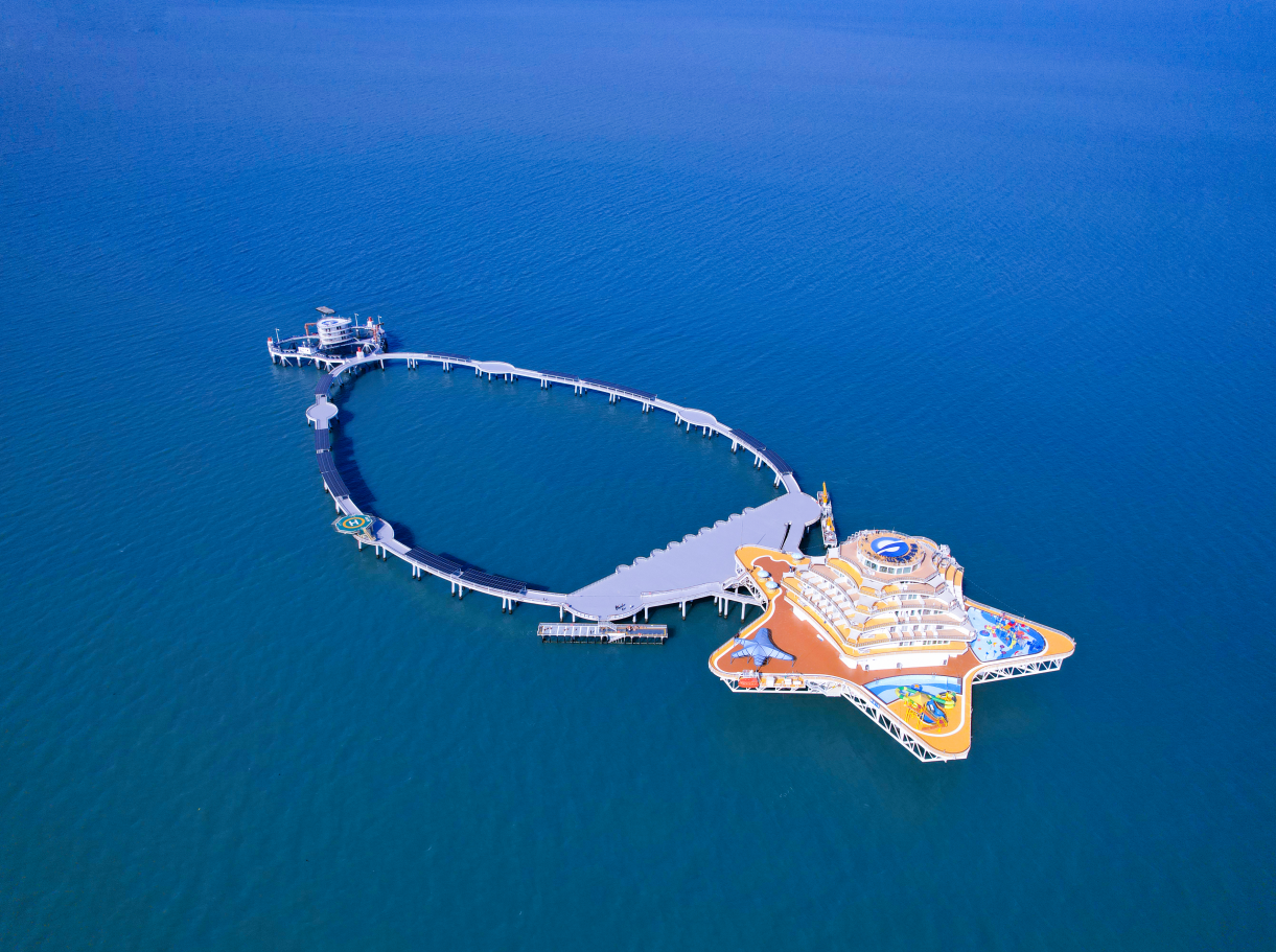 二期由全国最大单体生态养殖围栏与五角海星造型海洋牧场综合体平台组成,生态养殖围栏环绕形成四十万立方米超大养殖水体,综合体平台采用抗十二级台风的坐底插桩式钢制结构,室外甲板面积广阔,配套成人泳池、儿童水乐园、户外休闲演艺等多元休闲业态,七层室内空间精心规划综合保障服务区、海洋渔业科普展厅、餐饮庆典专属区域,平台最大载客量可达一千人,年接待游客能力超十五万人次,自2023年4月正式运营以来,已累计接待游客近九万人次,凭借优质海上游玩体验收获广大游客一致好评。