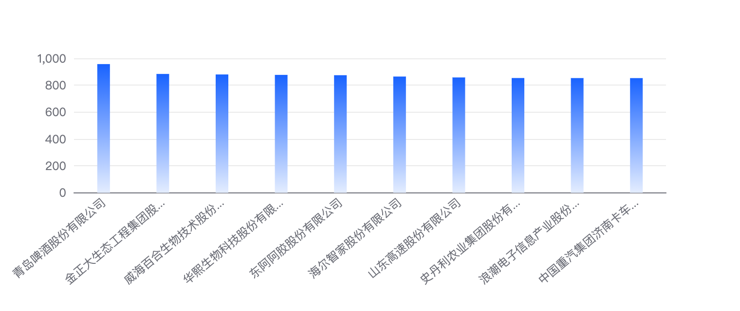 位居排行榜前十的分别是青岛啤酒股份有限公司、金正大生态工程集团股份有限公司、威海百合生物技术股份有限公司、华熙生物科技股份有限公司、东阿阿胶股份有限公司、海尔智家股份有限公司、山东高速股份有限公司、史丹利农业集团股份有限公司、浪潮电子信息产业股份有限公司、中国重汽集团济南卡车股份有限公司,其中排名上涨最多的是威海百合生物技术股份有限公司,提升24名。上个月排名前十的品牌本月下降最多的是山东高速股份有限公司,下降5名。