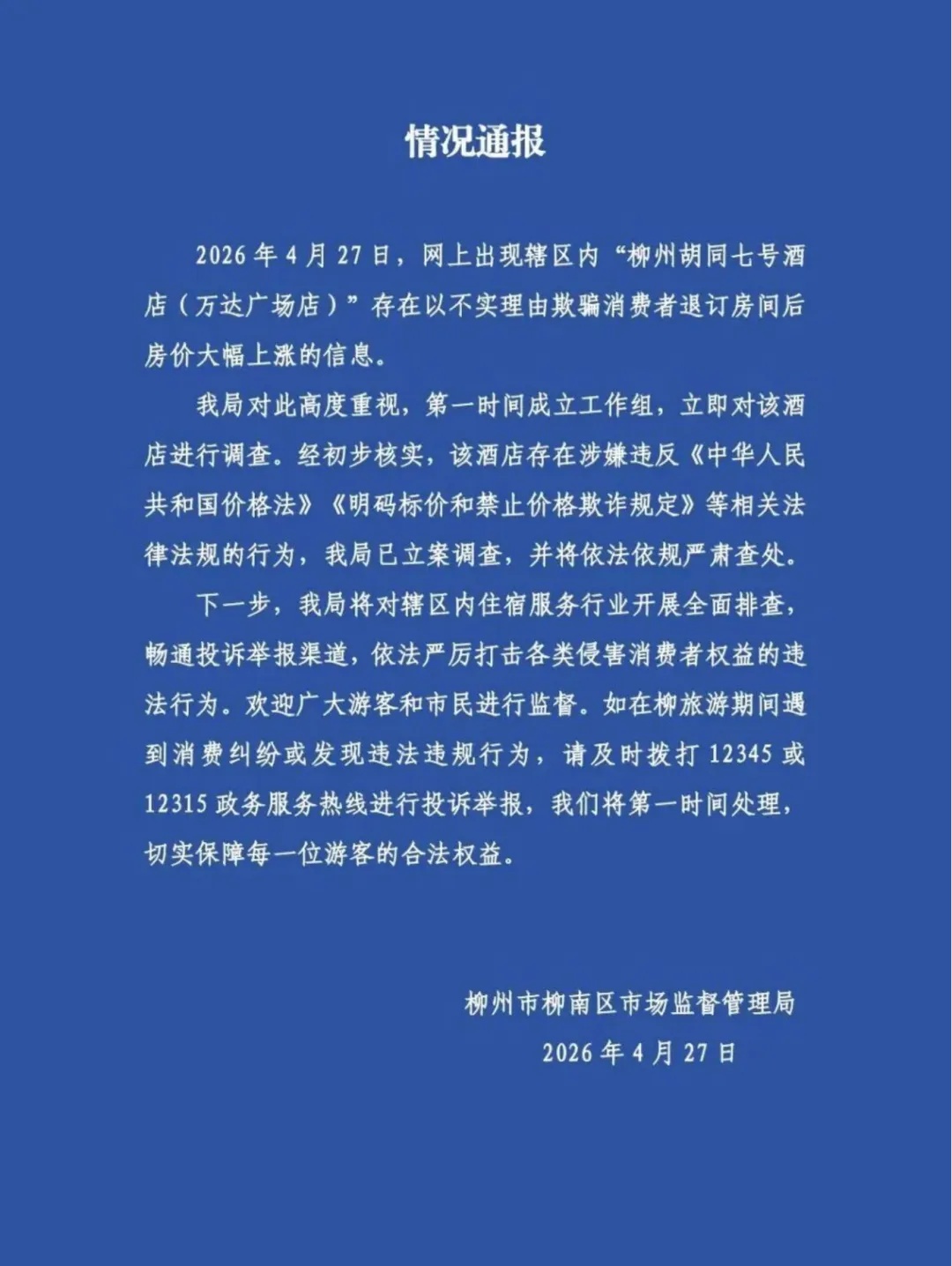 近日,有消费者反映,广西柳州一酒店以“老板离世”“门店将被查封”等理由,让其在平台退订两个月前预定的“五一”低价房,此后酒店却出现了大幅涨价的房源。4月28日,当地市场监督管理部门发布通报称,该酒店存在涉嫌违反《中华人民共和国价格法》《明码标价和禁止价格欺诈规定》等相关法律法规的行为,已被立案调查。