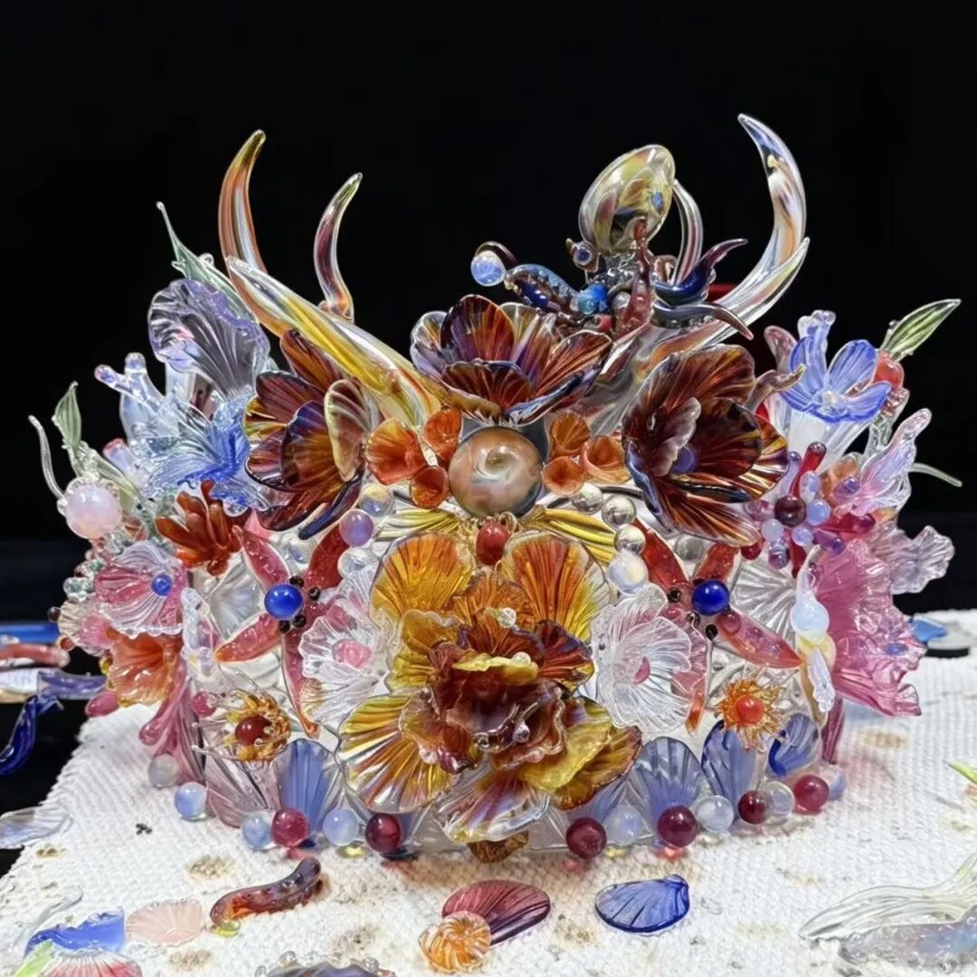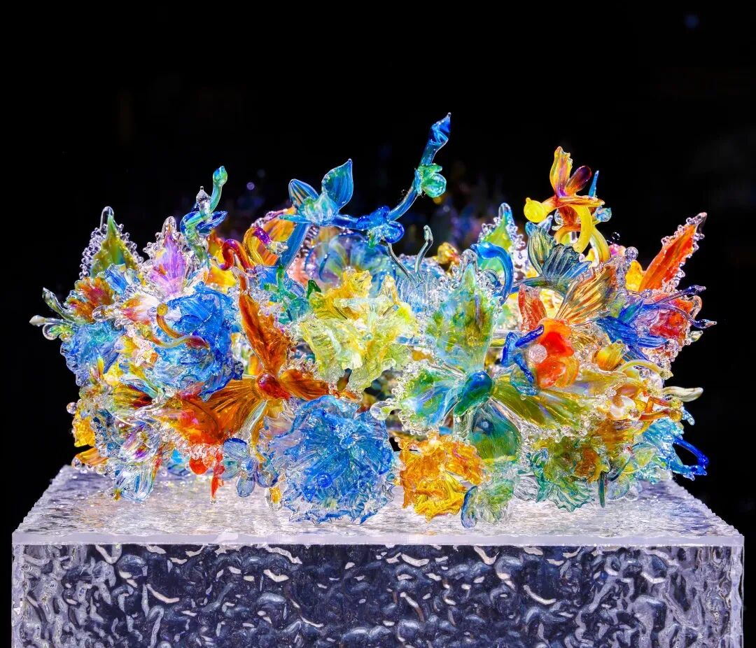 展览展出多件当代琉璃艺术大师的重磅首发与爆款佳作:蝴蝶灵蛇冠惊艳亮相;春晚同款《十二花神》系列琉璃华美登场,凝萃东方雅韵;《宝相仟华·敦煌琉祥云肩》首次公开展出,将敦煌美学与琉璃工艺完美交融,庄严华贵;更有当代年轻艺术家们专为本次展览青岛海洋主题定制的琉璃花冠,以海浪、珊瑚、水母等元素为灵感,让千年琉光与青岛山海气韵相映生辉。更有千只琉璃蝴蝶、琉璃万花筒等多元创意赋予琉璃全新生命力,尽显传统工艺的时代活力。