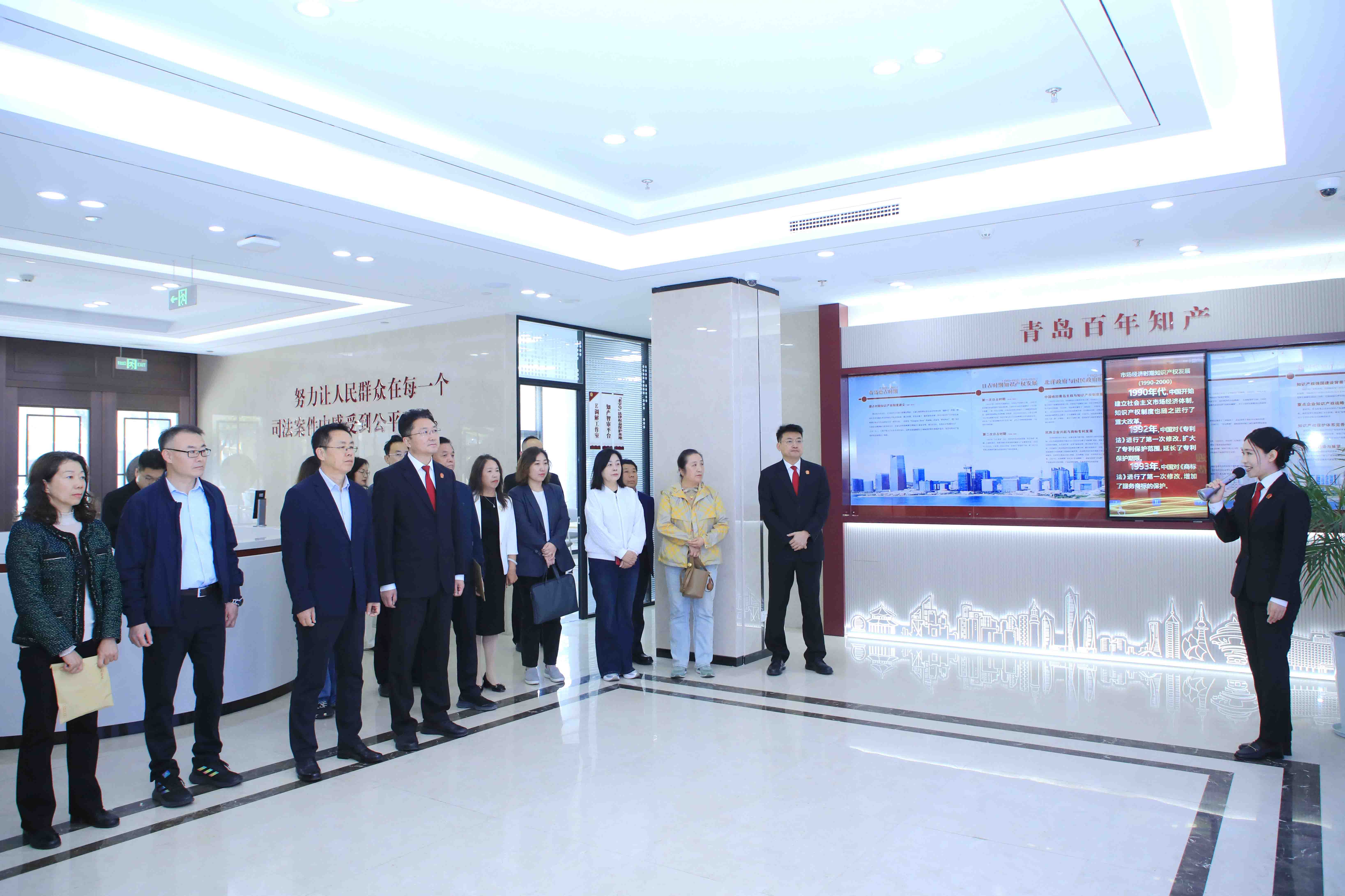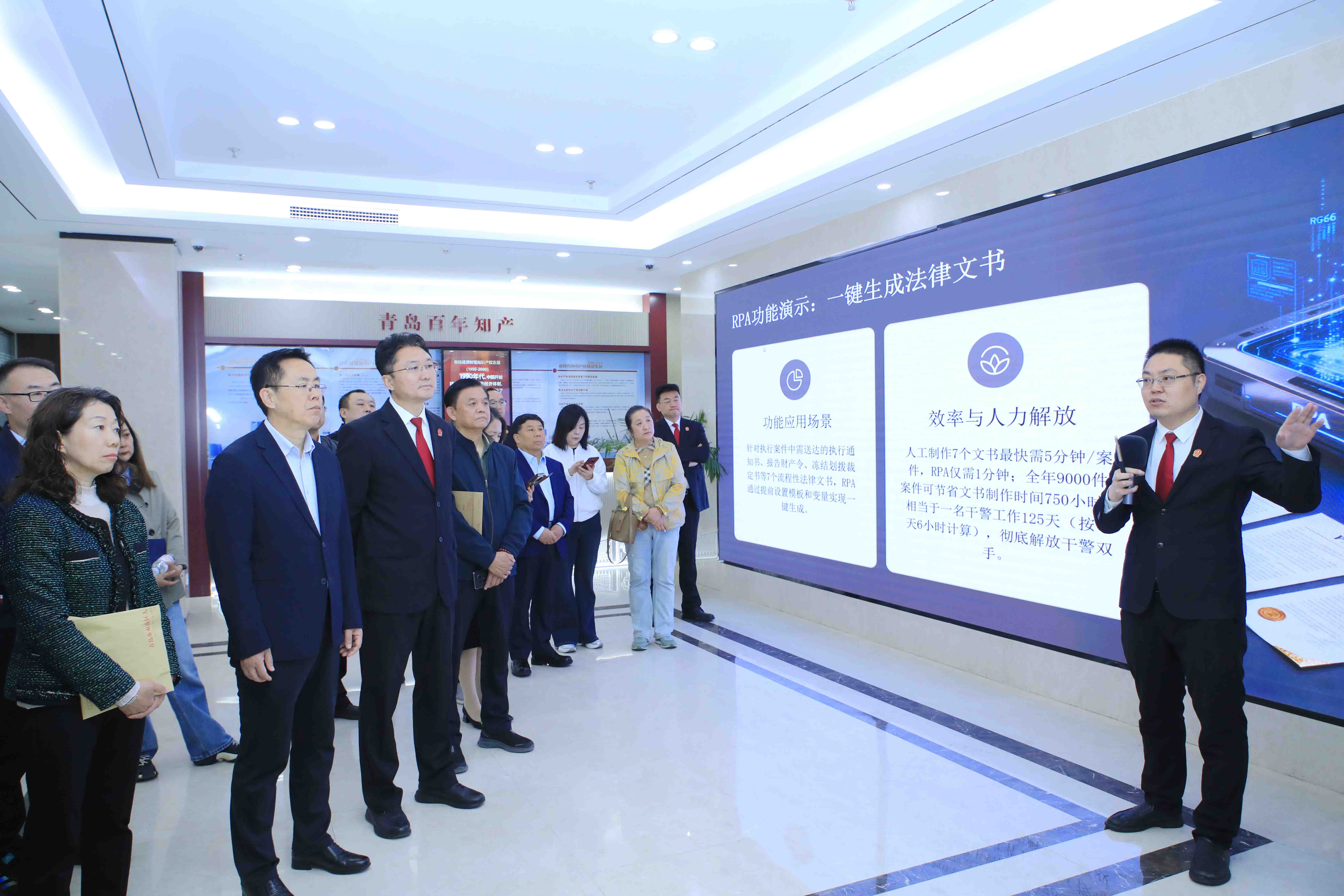 调研组首先参观了中山路法庭E执行中心,详细了解了金融执行工作情况,实地体验了RPA技术、VR看房等在金融执行中的应用,并直播连线房产拍卖勘验现场,“沉浸式”体验法院执行工作。随后,调研组还参观了市南区法院“天平之星”党建文化墙、集约查控中心等,深入了解了集约查控流程及工作成效。