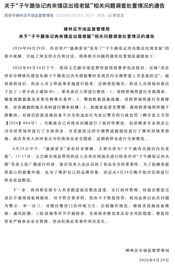 2026年04月29日,抖音用户“盛唐雷音”发布了“子午路张记肉夹馍店出现老鼠”的相关视频,引起了网友的关注和讨论。现将相关问题的调查处置情况通报如下: