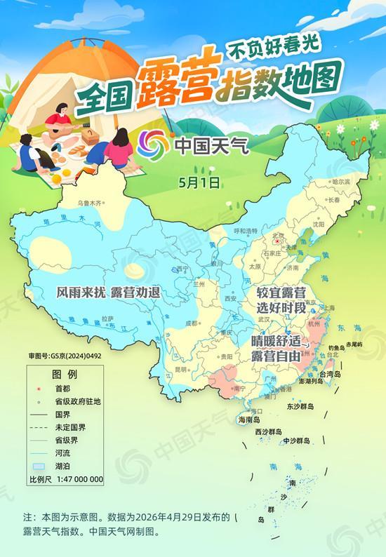 4月30日,中东部大部地区都属于“较宜露营”的区域。尤其北方地区将迎来一波升温小高潮,东北、华北、黄淮等地最高气温普遍将达到25℃左右,阳光和煦、风力不大。不过,夜间气温仍低,昼夜温差较大,适合白天露营。而在广东、广西部分地区,天气晴暖舒适,适宜露营。