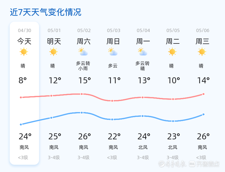 未来三天,泰安市天气趋势总体平稳。5月2日为多云转小雨,气温15℃至26℃,风力南风3-4级;5月3日为多云,气温11℃至22℃,风力南风小于3级;5月4日为多云转晴,气温13℃至24℃,风力北风3-4级。特别提醒市民,5月2日有小雨天气,出行时请注意携带雨具,防范降雨可能带来的交通不便。