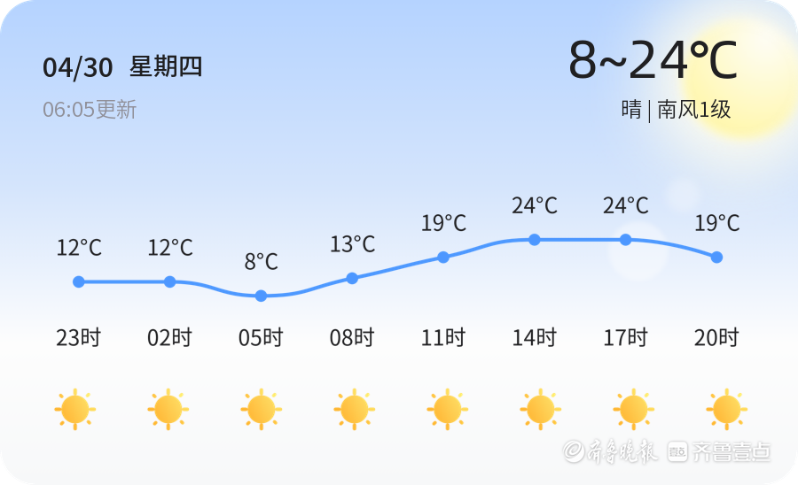今天是4月30日,星期四,农历三月十四。泰安市今日天气晴朗,南风1级,空气湿度为89%,PM2.5指数为48,空气质量良好。全市各区天气情况一致,均为晴天,最高气温24℃,最低气温8℃。市民们可以享受明媚的阳光,适合户外活动和出行。