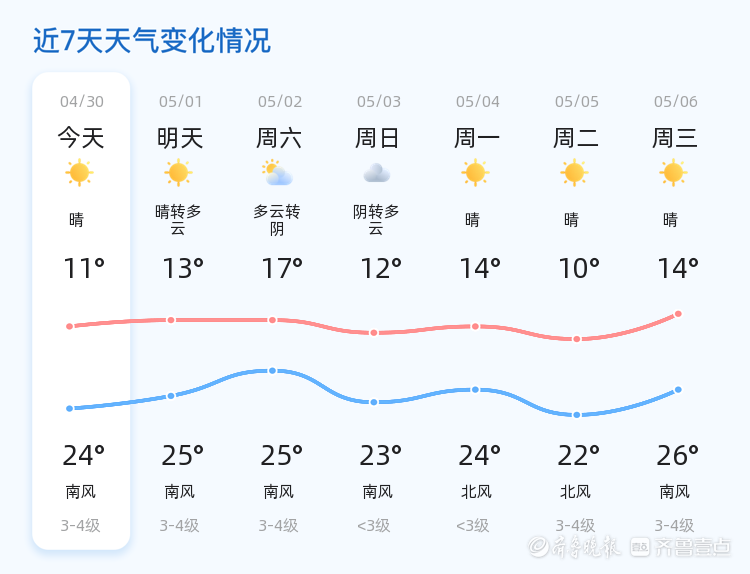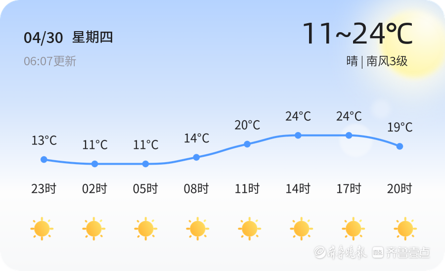 今天是4月30日,星期四,农历三月十四。聊城市的天气晴朗,气温适宜,最高气温24℃,最低气温11℃,当前温度12.8℃,湿度66%,空气质量良好,PM2.5指数为50。南风3级,整体天气状况良好,市民可享受明媚的阳光和清新的空气。全市各区天气情况一致,均为晴朗天气。
