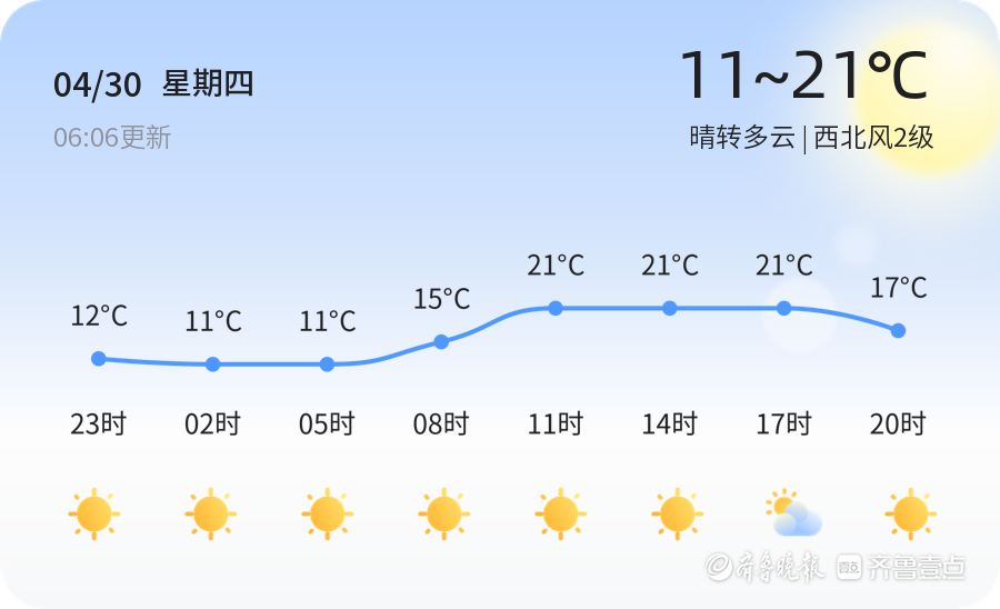 今日是4月30日,星期四,农历三月十四。日照市今日天气晴转多云,气温在11℃到21℃之间,西北风2级,空气湿度65%,PM2.5指数55,空气质量良好。各区天气情况基本一致,均为晴转多云,适合市民外出活动。