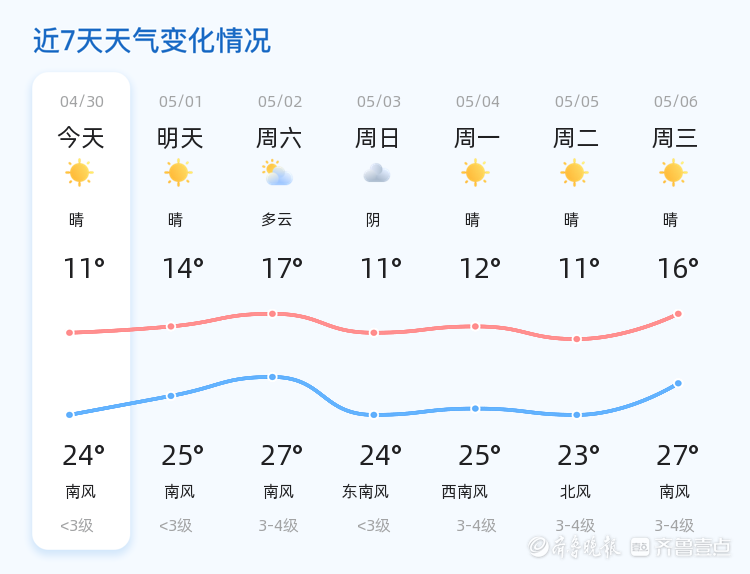 今天是4月30日,星期四,农历三月十四。德州迎来了一天的晴朗天气,气温适宜,适合市民出行。今天最高气温为24℃,最低气温为11℃,目前气温为9.9℃,东南风1级,空气湿度为75%,PM2.5指数为48,空气质量良好。