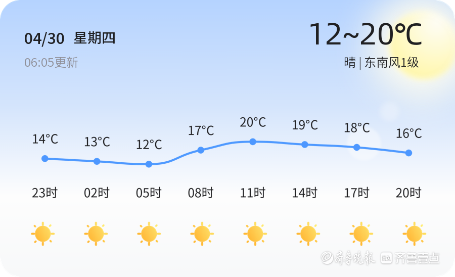今天是2026年4月30日,农历三月十四,威海市迎来晴朗的好天气。今日气温介于12℃至20℃之间,东南风1级,空气湿度为43%,PM2.5浓度为29微克/立方米,空气质量等级为优,适合户外活动。早晨气温较低,市民出行时请注意增添衣物,中午过后温度升高,适合外出活动。