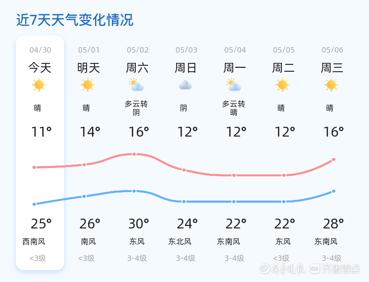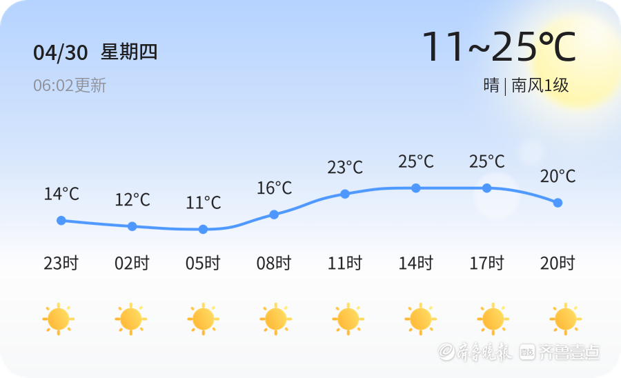今天是4月30日,星期四,农历三月十四。东营市迎来晴朗天气,全市各区气温适宜,最高气温25℃,最低气温11℃。当前时间为早上6点02分,实时温度11.2℃,天气晴朗,南风1级,空气湿度76%,PM2.5指数52,空气质量良好。市民可放心户外活动,享受春日阳光。