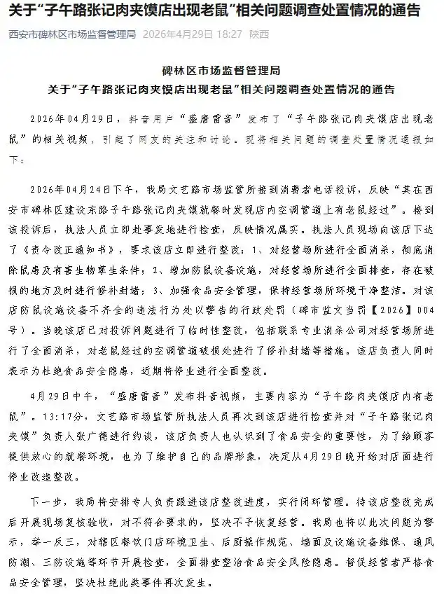 2026年4月29日,抖音用户“盛唐雷音”发布了“子午路张记肉夹馍店出现老鼠”的相关视频,引起了网友的关注和讨论。现将相关问题的调查处置情况通报如下: