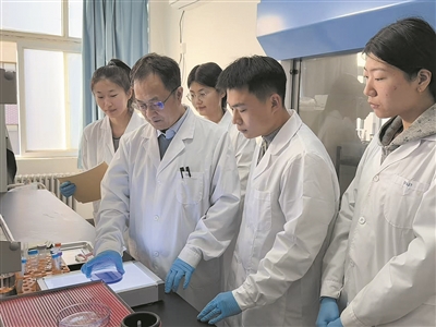 ■青岛科技大学前沿生物医药技术研究院院长窦效伟(左二)带领学生做实验。杨琪琪 摄