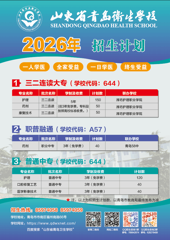 2.考生报考三二连读,职普融通须为2026年初中应届毕业生,招收范围是青岛市辖区,外地市无招生计划。