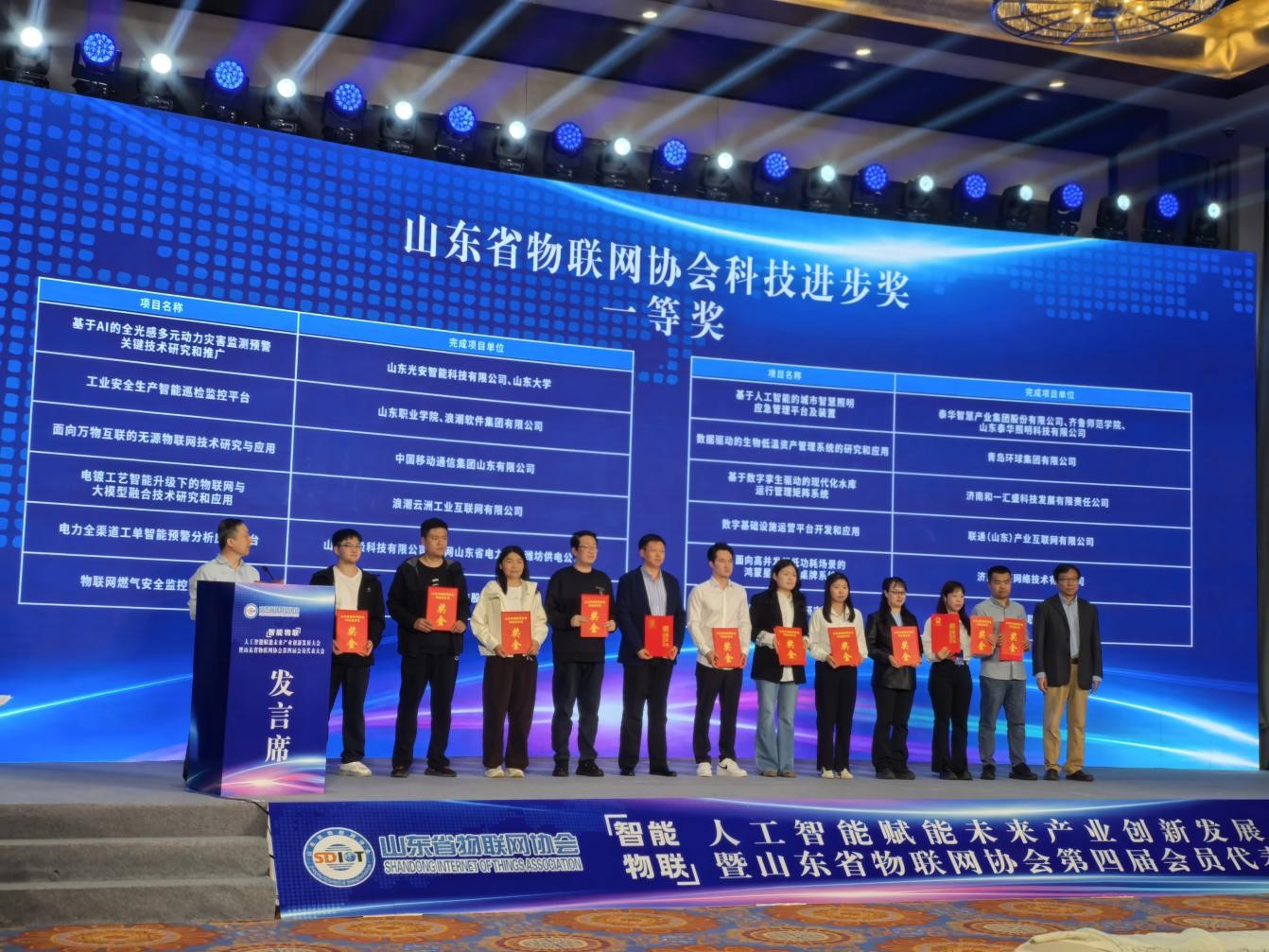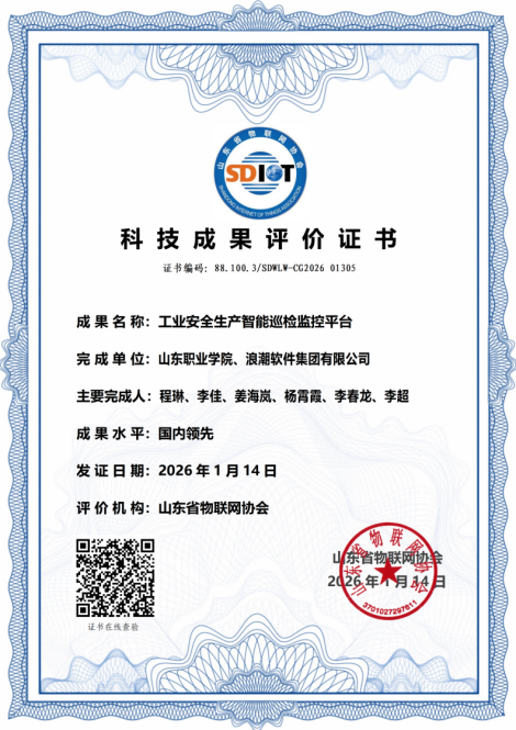 近日,由山东省物联网协会、山东省人工智能研究院等单位联合主办的“智能物联·人工智能赋能未来产业创新发展大会”在泰安召开。会上,颁发了2025年度山东省物联网协会科技进步奖。山东职业学院新一代信息技术学院软件技术专业与人工智能专业的程琳、李佳、姜海岚、杨霄霞四位教师,携手浪潮软件集团共同完成的“工业安全生产智能巡检监控平台”项目,荣获科技进步奖一等奖。