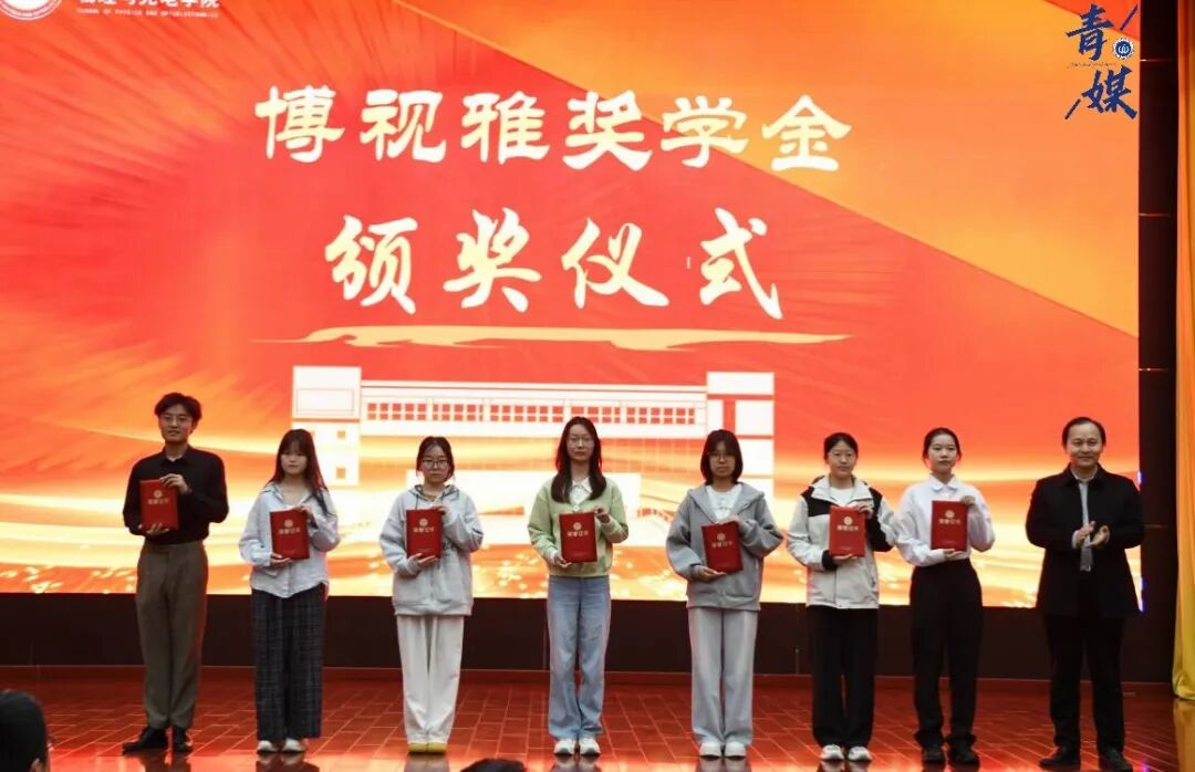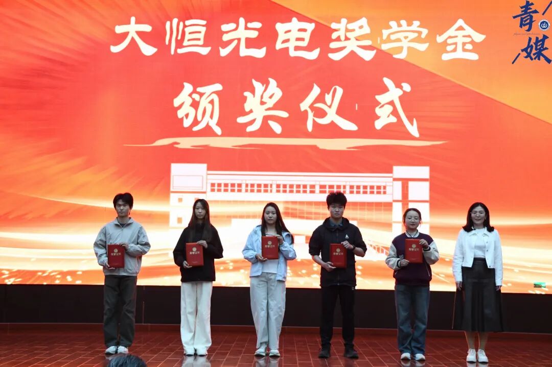 校团委书记尹弢、合作发展处副处长李敏、学生工作部副部长张萌、研究生院副院长李卫,学院党委书记谢德仁、副院长宋玉志等领导嘉宾上台,为获奖学子颁发荣誉证书与奖杯。本次仪式中,25名学生获评“物电好榜样”,27名学生分别荣获“博视雅奖学金”“大恒光电奖学金”“胡杨树奖学金”及“师润助学金”,充分展现了学院学子勤学善思、奋勇争先的良好精神风貌。