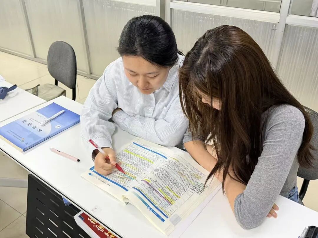 班级还形成了务实高效的互助模式:按报考方向与科目优势组建学习小组,成绩优异者主动讲解知识点、分享技巧;同专业伙伴坦诚交流进度、共享考点;所有备考资料公开共享,打破信息壁垒。针对基础薄弱、进度滞后的同学,班级固定结成帮扶对子,同伴陪同打卡、定制计划,用实际行动不让一个人掉队。两百多个日夜,同学们互为情绪港湾、彼此支撑兜底,把竞争化为共进,将内卷转化为合力,让“一起上岸”的约定照进现实。
