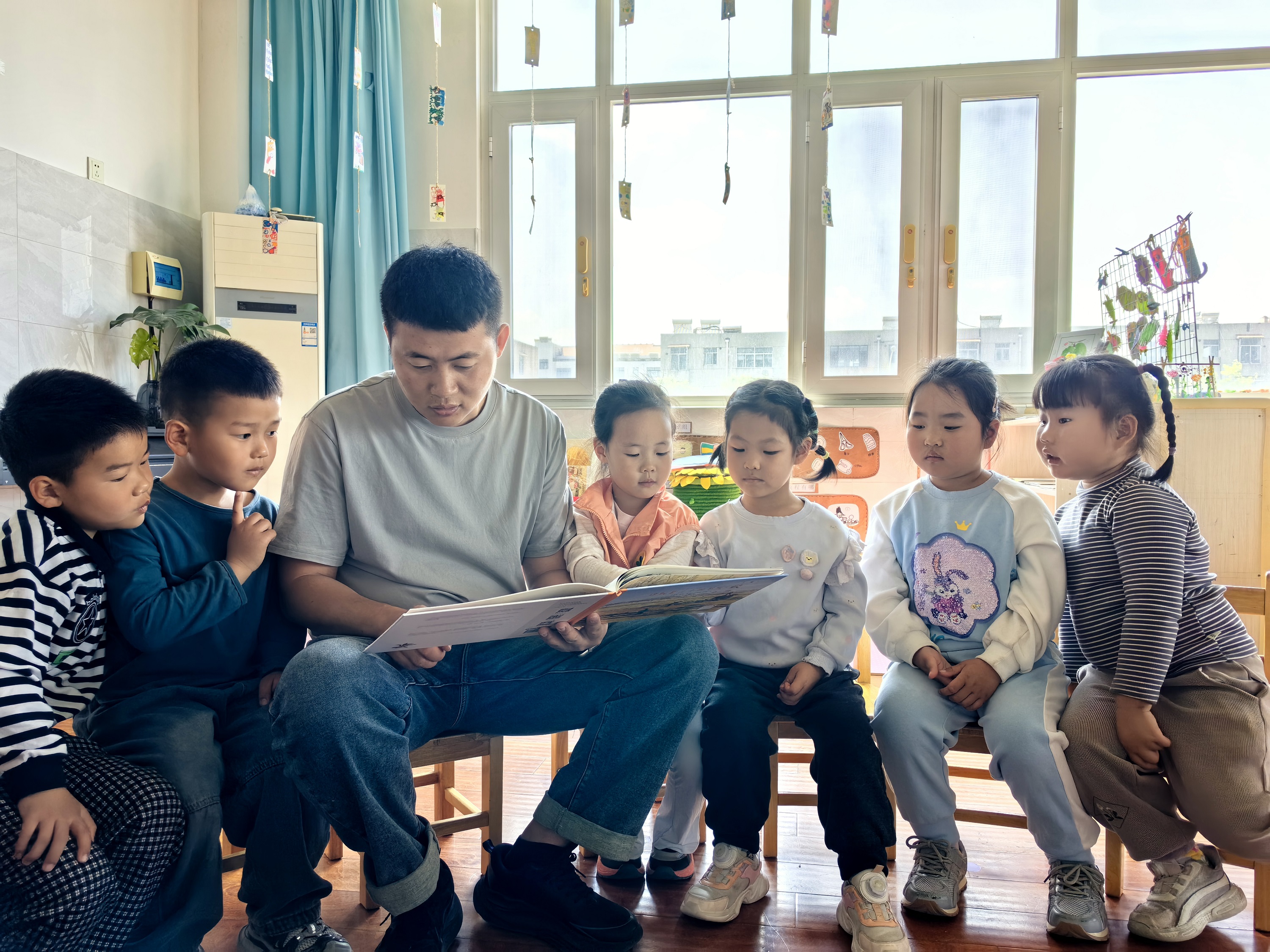 本次活动,故事爸爸为孩子们带来了趣味满满的绘本故事《14只老鼠去春游》。故事爸爸用舒缓亲切的语气,逐页带领孩子们品读绘本,不时抛出趣味问题引导孩子们主动观察、大胆表达:“小朋友们看一看,小老鼠们在春游路上都遇到了哪些有趣的风景呀?”孩子们纷纷高举小手,积极分享自己的观察与感受,在沉浸式倾听与互动中,真切感受到春日自然的美好,体会到小老鼠一家团结友爱、携手相伴的温暖,也在趣味故事中认识了春日景物、感知了自然变化,整场活动童趣盎然、温馨有爱。