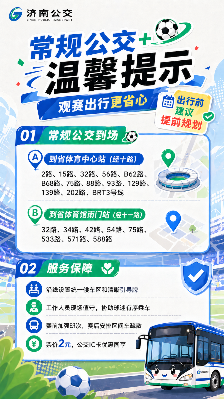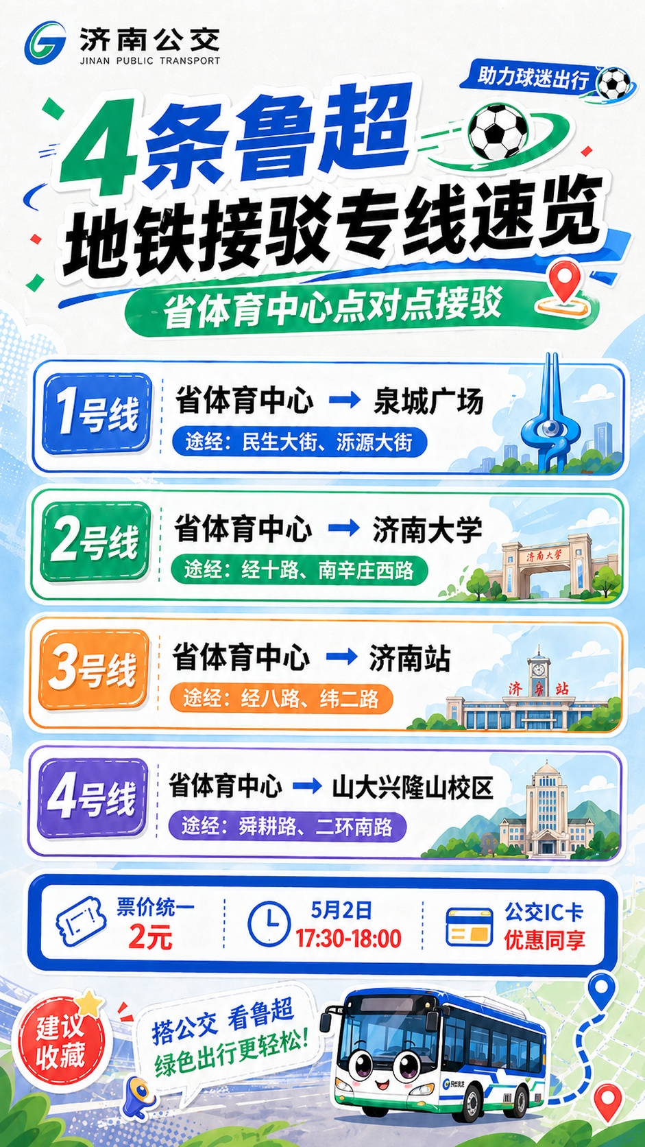 据悉,本次开通的4条接驳专线,票价统一为2元,同步执行公交IC卡优惠政策,让球迷出行更经济、更便捷。营运时间精准锁定赛事当日(5月2日)17:30-18:00,助力球迷出行。球迷朋友可选择多条常规公交线路前往赛事现场:可乘坐2路、15路、32路、56路、B62路、B68路、75路、88路、93路、129路、139路、202路、BRT3号线等,抵达省体育中心站(经十路);