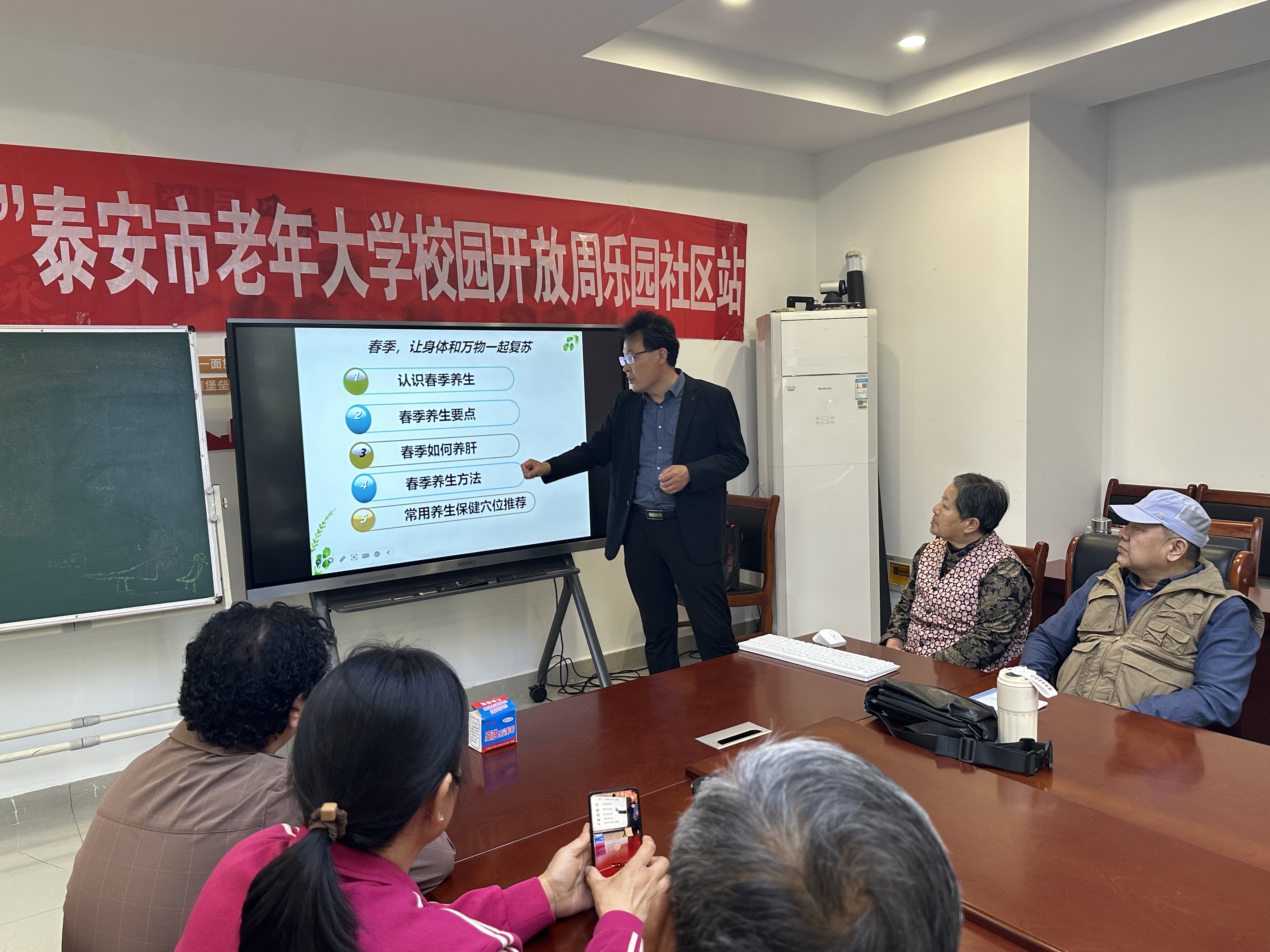 为普及春季科学养生知识,提升辖区居民健康保健意识,丰富社区居民精神文化生活,4月28日,泰山区财源街道乐园社区依托乐文书院这一社区文化便民阵地,特邀泰安市老年大学张德亮老师走进书院讲堂,开展春季养生健康科普讲座。乐文书院作为社区弘扬传统文化、服务居民群众的重要平台,常态化搭建学习交流载体,此次养生讲座吸引了众多辖区中老年居民早早到场落座,现场座无虚席、氛围浓厚。