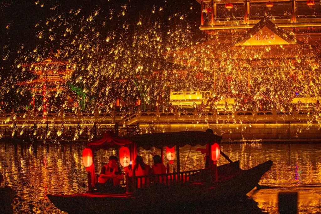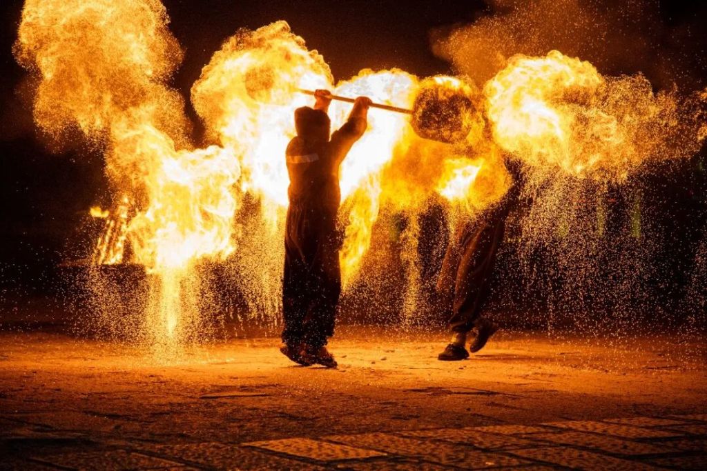 火龙钢花台儿庄夜游必看的硬核表演。1600℃的铁水奋力击向天空。刹那间,铁花飞溅,如流星坠地,如火树银花,在夜空中绽放成漫天金雨。