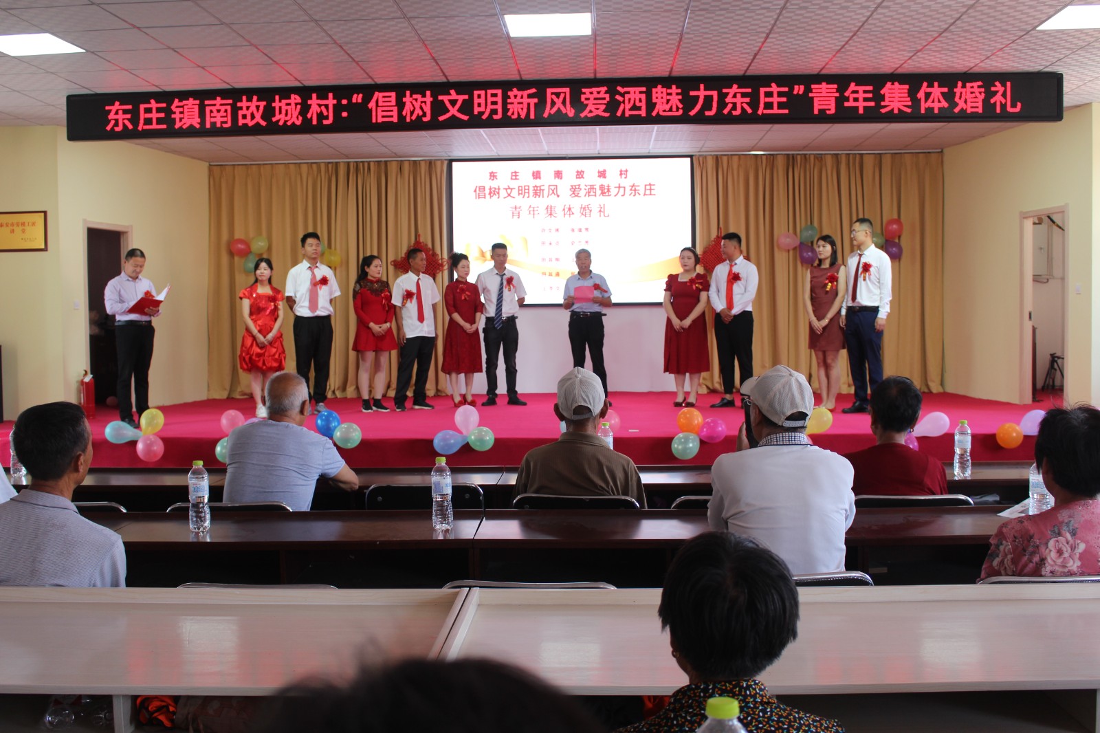 东庄镇南故城村青年集体婚礼,村党支部书记作为主婚人上台致辞并宣读倡议书。