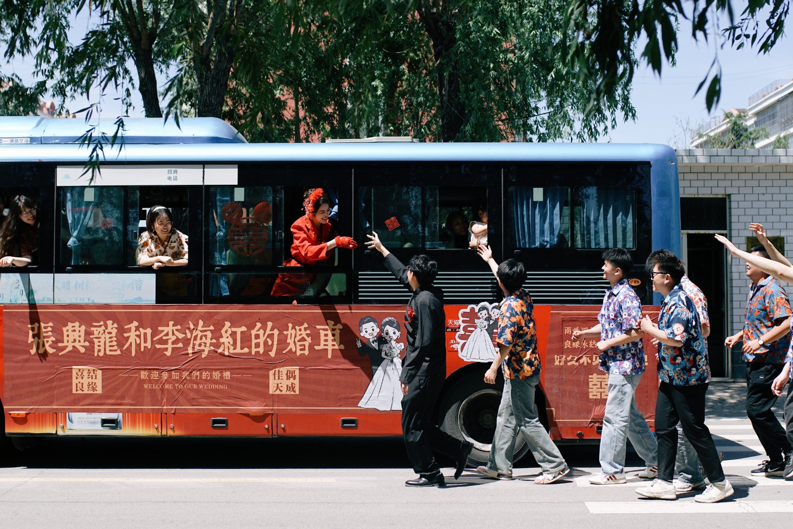 当地新人举办的公交车特色婚礼。