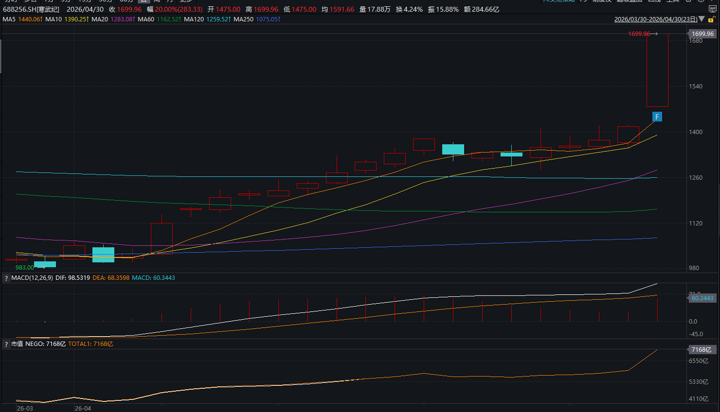 今天,ASIC龙头寒武纪“20CM”涨停,股价报1699.96元,寒武纪股价超越源杰科技,新晋成为A股 “股王”。截至收盘,寒武纪总市值7168亿元,日内成交额284.66亿元。