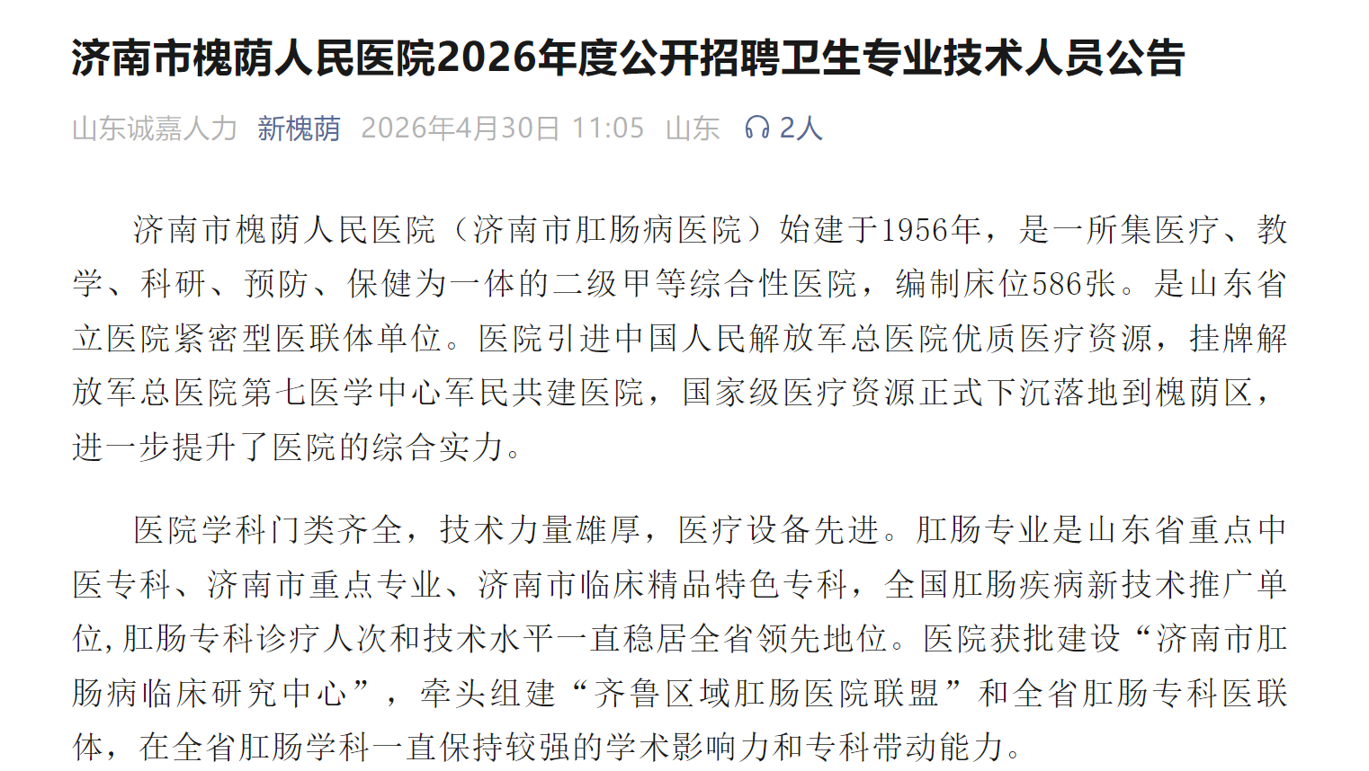 公示与聘用:最终录用名单将进行公示,公示期满无异议者将办理入职手续,一经录用与济南市槐荫人民医院直接签订劳动合同。
