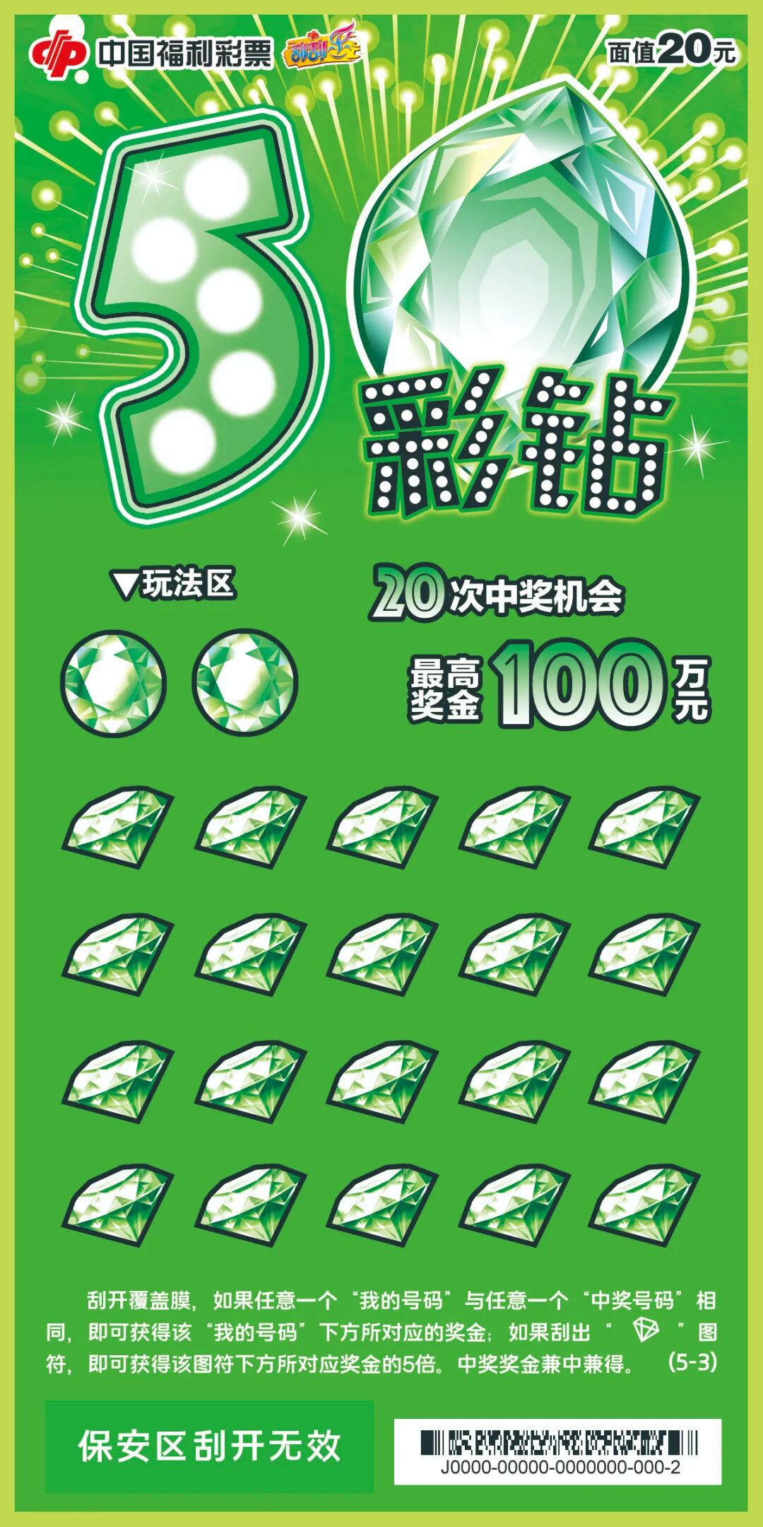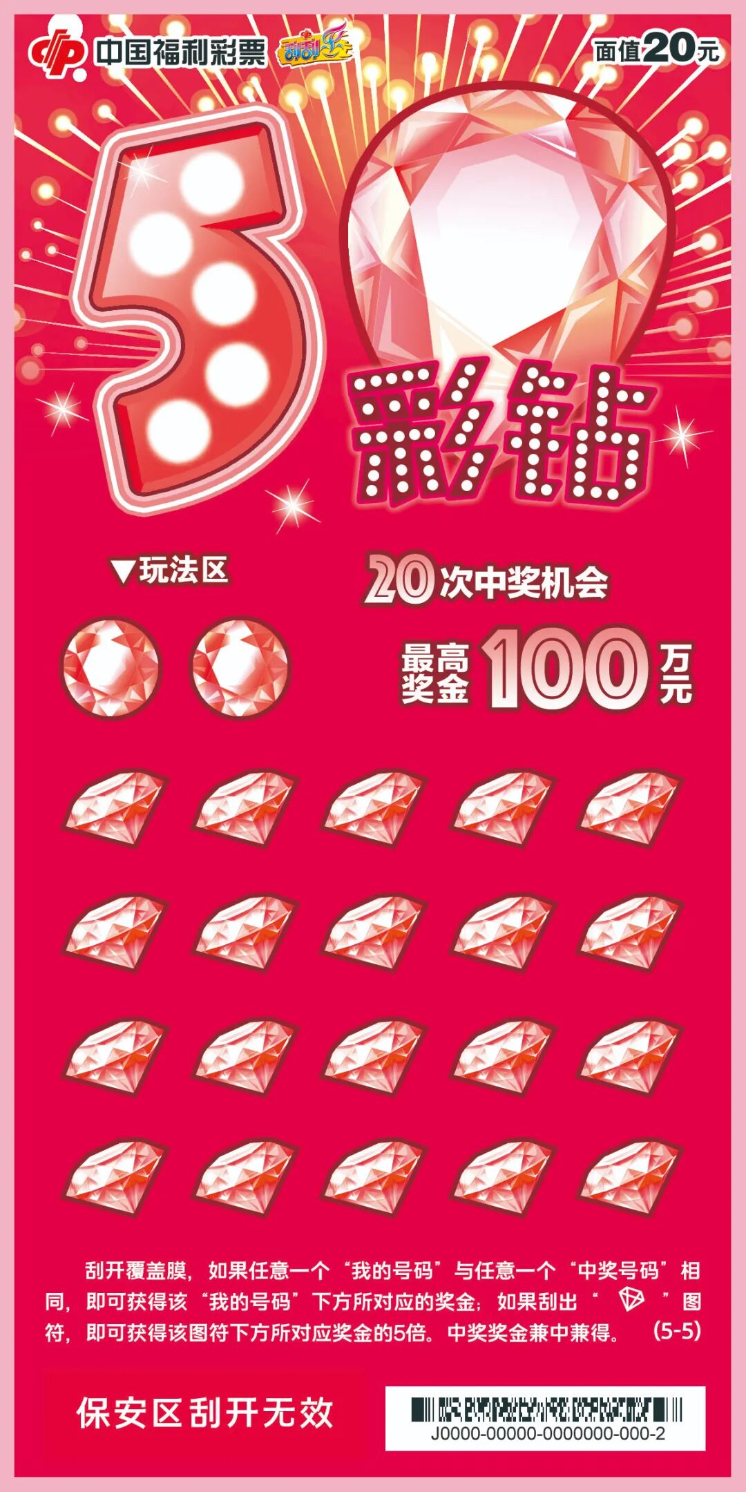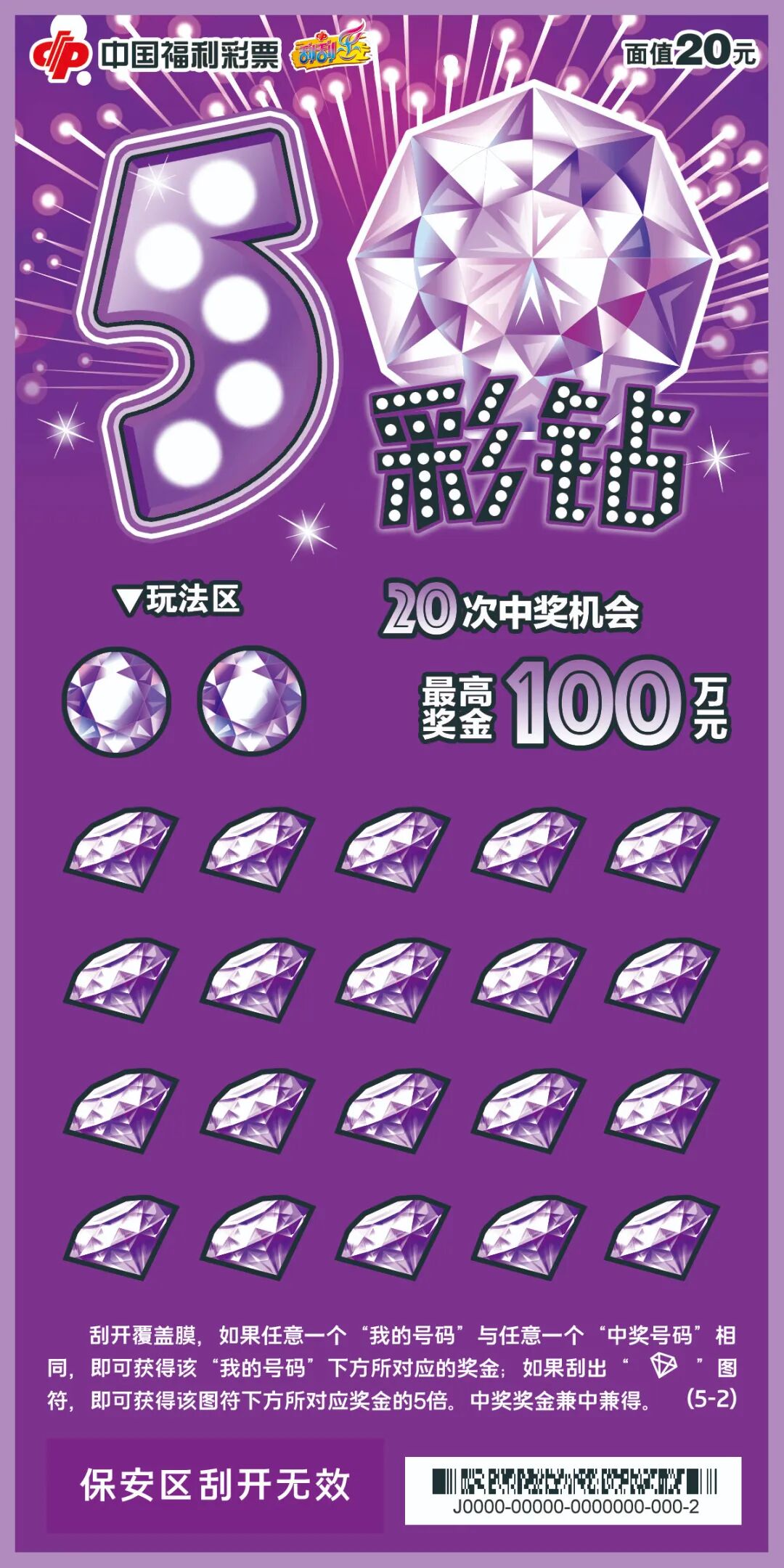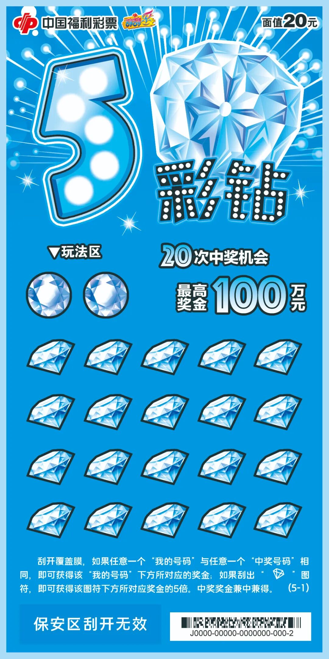 五张一套,五色钻石,最高100万。不管是自己刮一张试试手气,还是凑一套图个完整,“5彩钻”都是一款值得留意的票。