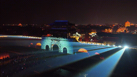 光影秀用现代科技重新诠释古城故事。一场光影叙事,浓缩了台儿庄的千年过往。从运河商贸的繁华,到台儿庄大战的惨烈,再到今日古城的重生,每一帧都让人屏息。