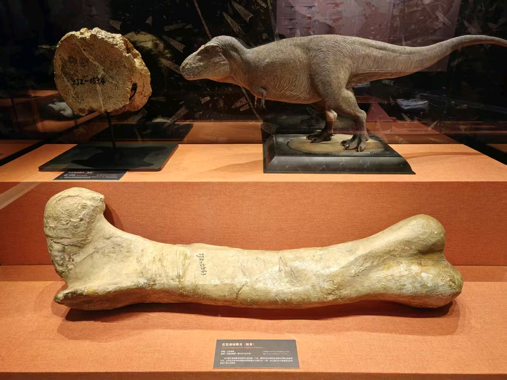 作为本次展览的亮点展品,诸城暴龙化石极具科研与观赏价值。其出土的股骨化石,一举刷新亚洲暴龙类股骨长度纪录;一枚宽度达28厘米的椎骨化石,尺寸可与世界知名霸王龙化石“苏”的对应椎骨相媲美,充分彰显了中国暴龙的强悍体型与霸主地位,也为研究东亚地区暴龙类演化、古生物地理分布提供了关键实物依据。