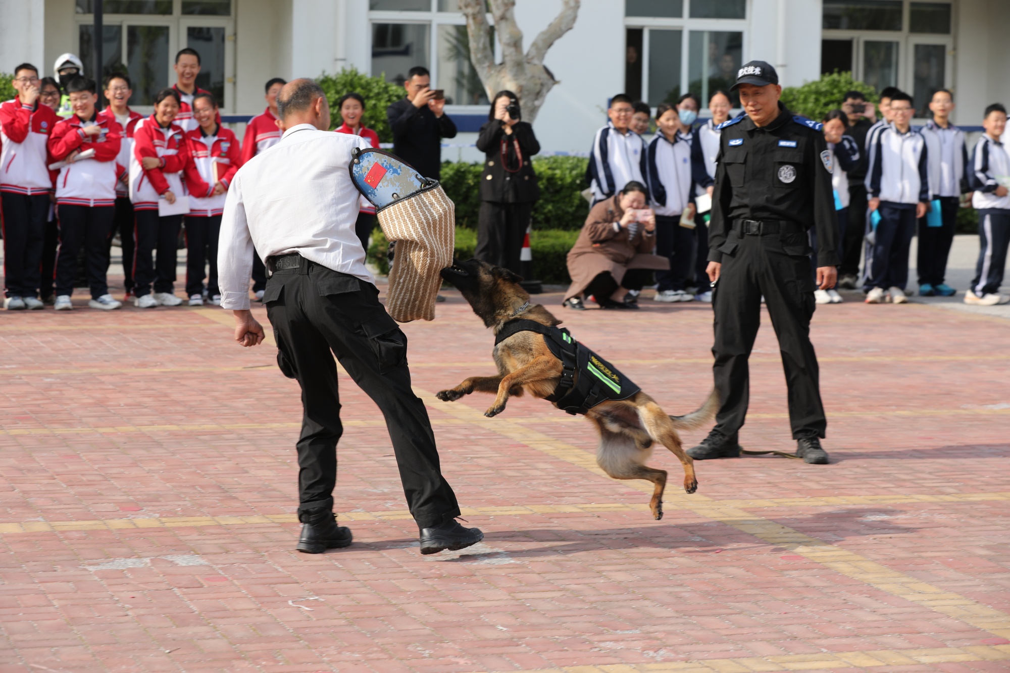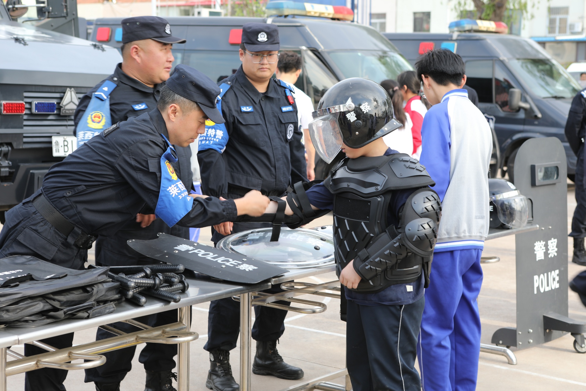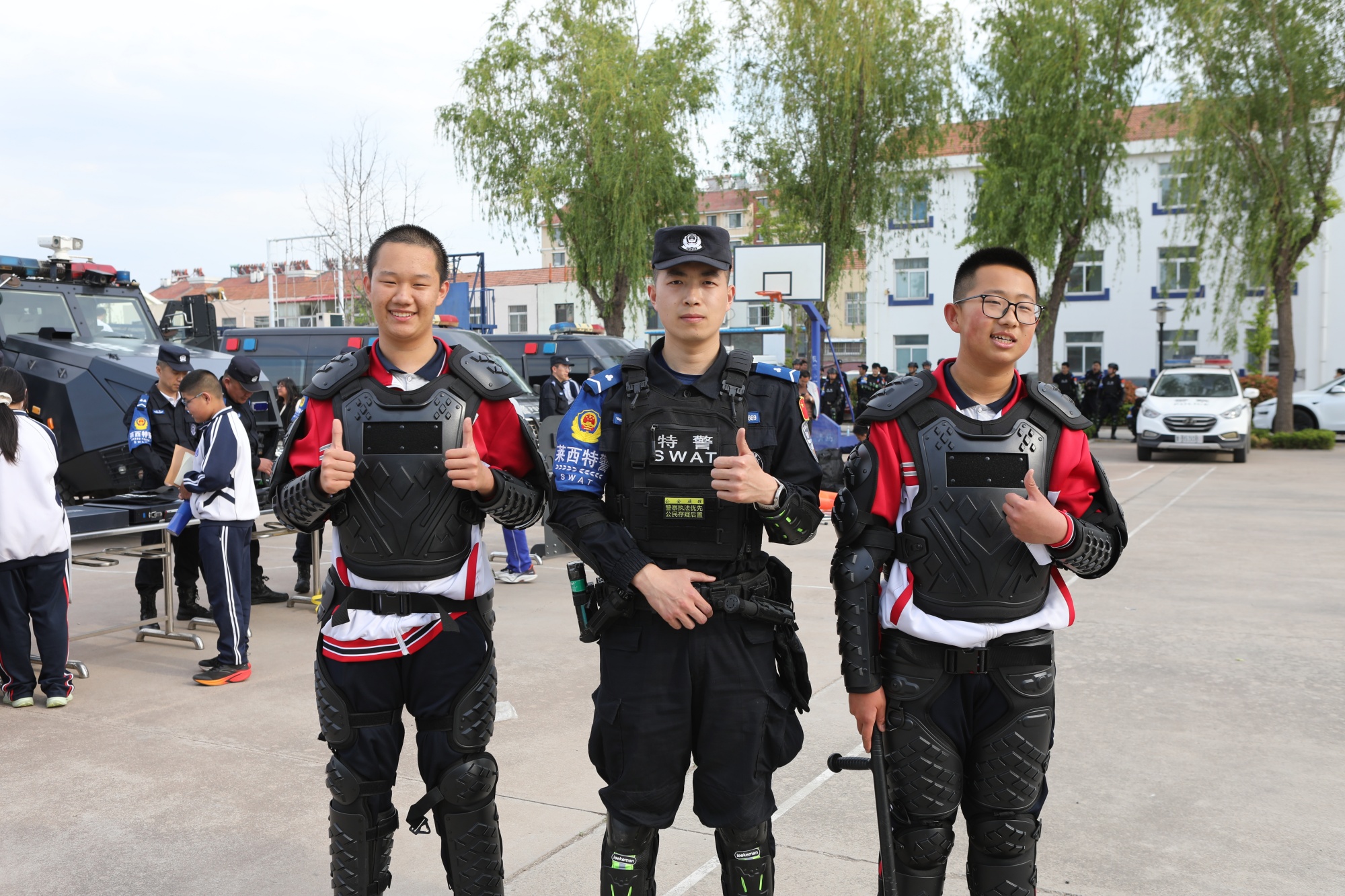 在参观环节,整洁规范的办公室、方方正正“豆腐块”、精良威猛的武器装备、井井有条的备勤区域,让同学们直观感受到了特警工作的严格与艰辛,大家惊叹不已、亲手尝试,在对比中学习自律,感受着严谨作风带来的力量;警犬扑咬、摩托车特技、实战演练……随着一系列精彩的科目演示轮番上演,将此次活动氛围推向高潮。警犬灵敏的反应、矫健的身姿,展现着刑侦队伍的专业素养;警用摩托车编队穿梭、精准制动,尽显交管队员的精湛技艺;特警队列队形整齐划一,擒敌拳、防暴处突战术演示刚劲有力,最小作战单元协同作战默契十足,每一个动作都彰显着特警队伍守护平安的硬核实力,现场掌声不断、齐声喝彩。在装备体验环节,同学们更是兴致勃勃,头盔、防弹衣、防暴盾牌……轮换穿戴体验,同时近距离触摸巡逻车、防暴车等警用装备,特警队员们则边辅助同学们体验、边讲解装备功能,并耐心解答同学们的疑问,让大家在亲身体验中既了解了警用装备的性能和作用,又进一步增强了自身安全防范意识。