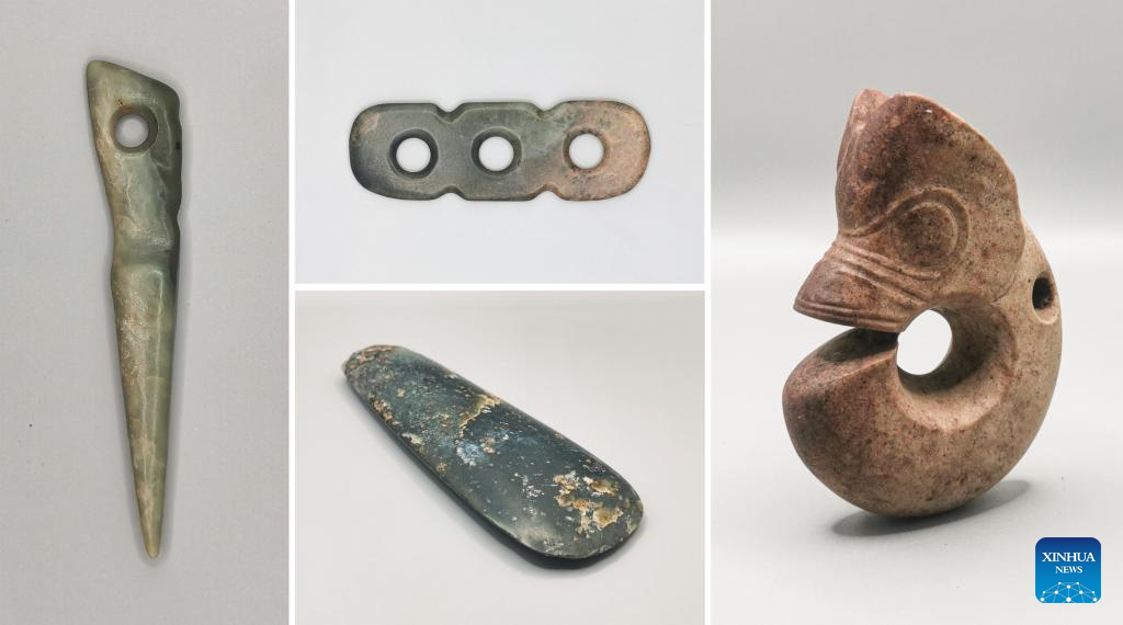 This combo file photo shows jade artifacts unearthed from stone mound tombs at the Zhengjiagou site in Xuanhua, north China's Hebei Province. (Xinhua)