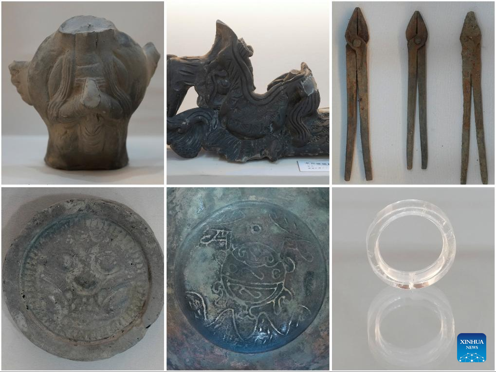 This combo photo taken on July 23, 2024 shows artifacts discovered from the ancient Yue State capital site and the Kuaiji Commandery Site from the Han Dynasty (202 B.C.-25 A.D.) to the Six Dynasties period (222-589) in Shaoxing, east China's Zhejiang Province. (Xinhua/Weng Xinyang)