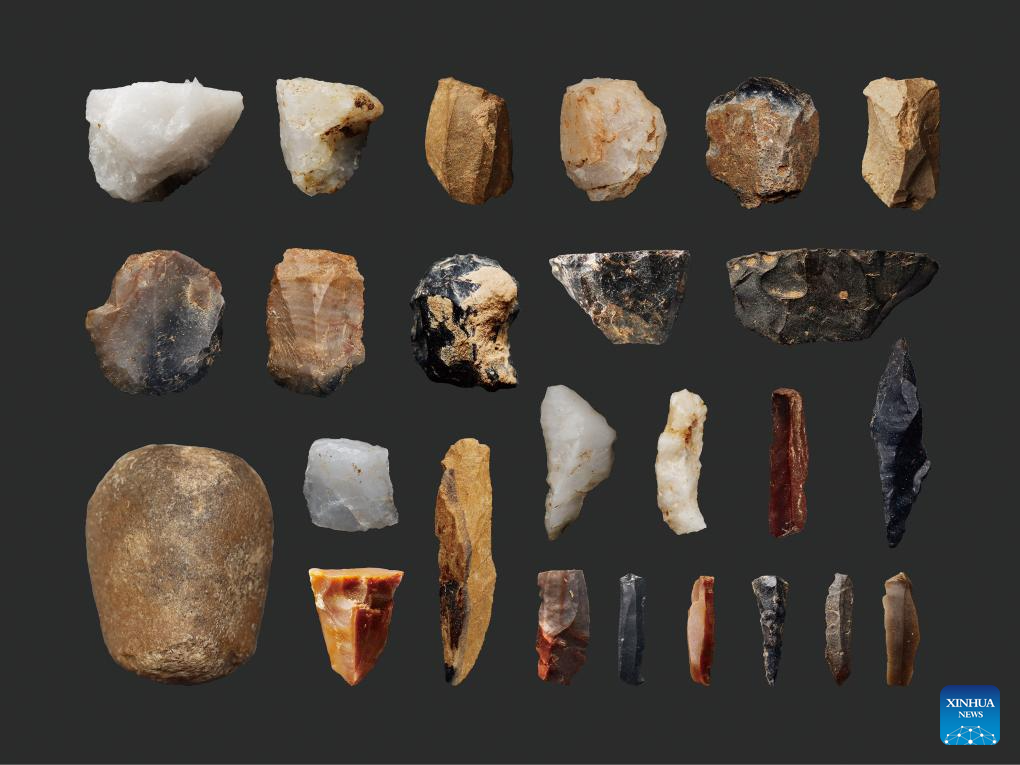 This combo file photo shows polished stone tools unearthed from the Dadong Paleolithic site in Helong City, one of the cluster of Paleolithic sites in the Changbai Mountains in northeast China's Jilin Province. (Xinhua)