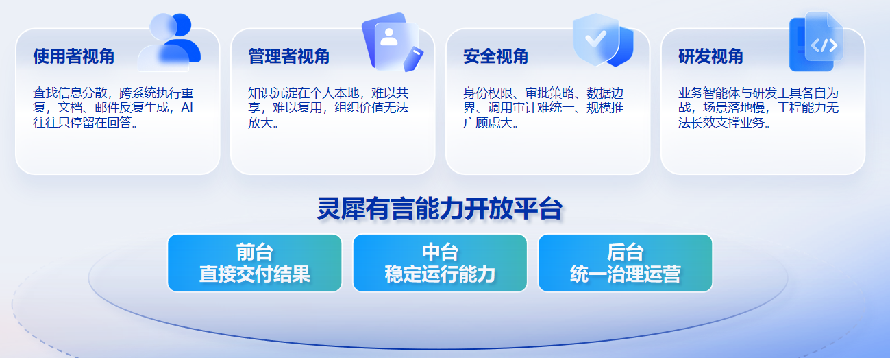 灵犀有言能力开放平台,直击全角色痛点,解决了传统AI应用中能力分散、难以共享、权限难统一等问题,实现了通用能力的可管、可用、可控。