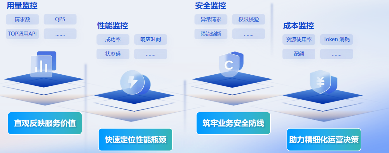 平台提供了多维度的监控数据实时可视化功能,包括用量监控、安全监控、性能监控和成本监控等。管理者可以全面掌控API服务的运行状态,直观地看到请求数、QPS、异常请求、Token消耗等关键指标,从而快速定位性能瓶颈,助力精细化运营决策。